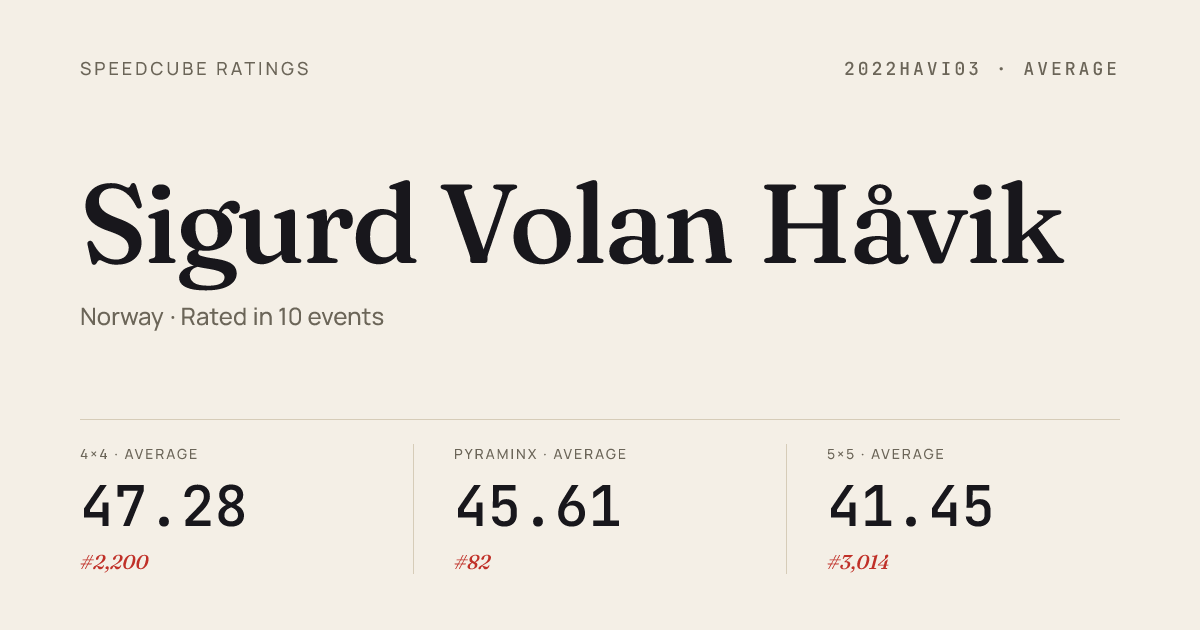 Feb 22, 20263x3x3 Cube · Round 2LierskogenVinterkubing2026 · 10th9.61Feb 22, 20263x3x3 Cube · FinalLierskogenVinterkubing2026 · 10th10.25Feb 22, 20263x3x3 One-Handed · Round 1LierskogenVinterkubing2026 · 19th28.64Feb 22, 20263x3x3 One-Handed · FinalLierskogenVinterkubing2026 · 22nd29.12Feb 22, 20264x4x4 Cube · FinalLierskogenVinterkubing2026 · 7th38.06Feb 22, 20264x4x4 Cube · Round 1LierskogenVinterkubing2026 · 9th39.92Feb 22, 20265x5x5 Cube · FinalLierskogenVinterkubing2026 · 8th1:20.60Feb 22, 20265x5x5 Cube · Round 1LierskogenVinterkubing2026 · 9th1:23.99Feb 22, 2026Clock · FinalLierskogenVinterkubing2026 · 3rd5.92Feb 22, 2026Clock · Round 1LierskogenVinterkubing2026 · 4th5.78Feb 22, 2026Megaminx · FinalLierskogenVinterkubing2026 · 6th1:07.29Feb 22, 2026Pyraminx · Round 1LierskogenVinterkubing2026 · 49th2.14Feb 22, 2026Skewb · FinalLierskogenVinterkubing2026 · 6th6.35Feb 22, 2026Skewb · Round 1LierskogenVinterkubing2026 · 4th5.52Nov 9, 20252x2x2 Cube · Round 2KjellerOpen2025 · 4th3.21Nov 9, 20252x2x2 Cube · Round 1KjellerOpen2025 · 33rd4.89Nov 9, 2025Pyraminx · Round 1KjellerOpen2025 · 1st2.31Nov 9, 2025Pyraminx · FinalKjellerOpen2025 · 1st2.28Oct 5, 20252x2x2 Cube · Round 1TrondheimHost2025 · 7th3.96