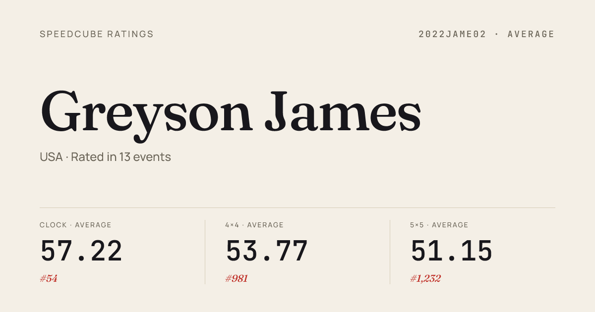 Sep 7, 20253x3x3 One-Handed · FinalOregonChampionship2025 · 4th13.95Sep 7, 20253x3x3 One-Handed · Round 1OregonChampionship2025 · 6th15.27Sep 7, 20254x4x4 Cube · FinalOregonChampionship2025 · 1st32.62Sep 7, 20254x4x4 Cube · Round 1OregonChampionship2025 · 6th36.23Sep 7, 20255x5x5 Cube · Round 1OregonChampionship2025 · 6th1:03.68Sep 7, 20255x5x5 Cube · FinalOregonChampionship2025 · 6th1:05.13Sep 7, 20256x6x6 Cube · Combined FinalOregonChampionship2025 · 7th2:26.95Sep 7, 20257x7x7 Cube · Combined FinalOregonChampionship2025 · 10th4:15.34Sep 7, 2025Clock · FinalOregonChampionship2025 · 12th4.46Sep 7, 2025Clock · Round 1OregonChampionship2025 · 1st3.43Sep 7, 2025Megaminx · Combined FinalOregonChampionship2025 · 2nd54.47Sep 7, 2025Pyraminx · FinalOregonChampionship2025 · 3rd2.80Sep 7, 2025Pyraminx · Round 1OregonChampionship2025 · 6th3.96Sep 7, 2025Skewb · FinalOregonChampionship2025 · 4th3.61Sep 7, 2025Skewb · Round 1OregonChampionship2025 · 4th4.70Sep 7, 2025Square-1 · FinalOregonChampionship2025 · 6th11.57Sep 7, 2025Square-1 · Round 1OregonChampionship2025 · 5th9.47Jul 6, 20252x2x2 Cube · Round 2WC2025 · world · 86th2.21Jul 6, 20252x2x2 Cube · Round 1WC2025 · world · 47th1.73