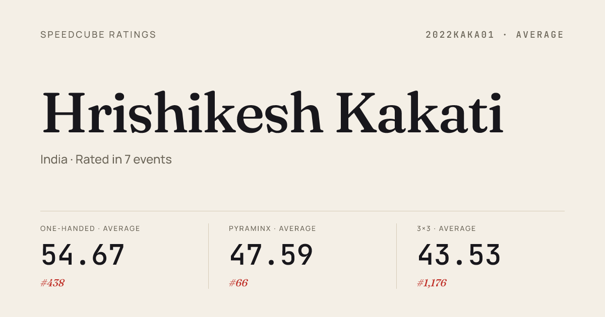 Mar 7, 20263x3x3 One-Handed · FinalYubaCitySpring2026 · 1st13.11Mar 7, 20264x4x4 Cube · Round 1YubaCitySpring2026 · 18th50.05Mar 7, 2026Clock · Round 1YubaCitySpring2026 · 4th6.42Mar 7, 2026Clock · FinalYubaCitySpring2026 · 7th7.00Mar 7, 2026Skewb · Round 1YubaCitySpring2026 · 7th5.02Mar 7, 2026Skewb · FinalYubaCitySpring2026 · 9th9.36Mar 1, 20263x3x3 Cube · FinalBerkeleyFavorites2026 · 7th8.30Mar 1, 20263x3x3 Cube · Round 2BerkeleyFavorites2026 · 11th8.59Mar 1, 20263x3x3 Cube · Round 1BerkeleyFavorites2026 · 11th8.75Mar 1, 20263x3x3 One-Handed · Round 1BerkeleyFavorites2026 · 6th13.09Mar 1, 20263x3x3 One-Handed · FinalBerkeleyFavorites2026 · 5th13.68Mar 1, 2026Clock · Combined FinalBerkeleyFavorites2026 · 7th6.07Mar 1, 2026Pyraminx · FinalBerkeleyFavorites2026 · 1st1.96Jan 18, 20262x2x2 Cube · Round 1SacCubingXXII2026 · 10th2.77Jan 18, 20262x2x2 Cube · FinalSacCubingXXII2026 · 11th3.21Jan 18, 20263x3x3 Cube · Round 1SacCubingXXII2026 · 9th8.76Jan 18, 20263x3x3 Cube · Round 2SacCubingXXII2026 · 21st9.74Jan 18, 20264x4x4 Cube · Round 1SacCubingXXII2026 · 38th52.78Jan 18, 2026Pyraminx · FinalSacCubingXXII2026 · 1st2.93