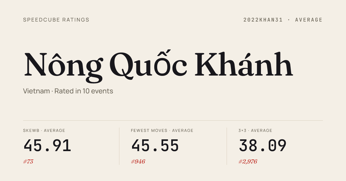 Mar 22, 20262x2x2 Cube · Round 1MYHMHaNxNoi2026 · 20th4.07Mar 22, 20262x2x2 Cube · Round 2MYHMHaNxNoi2026 · 24th4.25Mar 22, 20263x3x3 Cube · Round 2MYHMHaNxNoi2026 · 24th9.29Mar 22, 20263x3x3 Cube · Round 1MYHMHaNxNoi2026 · 50th11.69Mar 22, 20263x3x3 One-Handed · Round 1MYHMHaNxNoi2026 · 49th28.78Mar 22, 20264x4x4 Cube · Round 1MYHMHaNxNoi2026 · 35th48.73Mar 22, 20265x5x5 Cube · Round 1MYHMHaNxNoi2026 · 47th2:50.46Sep 21, 20252x2x2 Cube · Round 1HanoiSummer2025 · 28th3.94Sep 21, 20253x3x3 Cube · Round 2HanoiSummer2025 · 27th9.97Sep 21, 20253x3x3 Cube · Round 1HanoiSummer2025 · 29th10.10Sep 21, 20253x3x3 One-Handed · Round 1HanoiSummer2025 · 54th27.73Sep 21, 20254x4x4 Cube · Round 1HanoiSummer2025 · 53rd57.68Sep 21, 20255x5x5 Cube · Round 1HanoiSummer2025 · 42nd2:08.50Sep 21, 2025Megaminx · Combined FinalHanoiSummer2025 · 19th1:32.30Sep 21, 2025Pyraminx · Round 1HanoiSummer2025 · 38th13.62Sep 21, 2025Skewb · Round 1HanoiSummer2025 · 1st2.59Sep 21, 2025Skewb · FinalHanoiSummer2025 · 1st2.90Sep 21, 2025Square-1 · FinalHanoiSummer2025 · 5th12.35Sep 21, 2025Square-1 · Round 1HanoiSummer2025 · 5th11.92Aug 17, 20252x2x2 Cube · Round 1VietnamChampionship2025 · national · 44th3.96