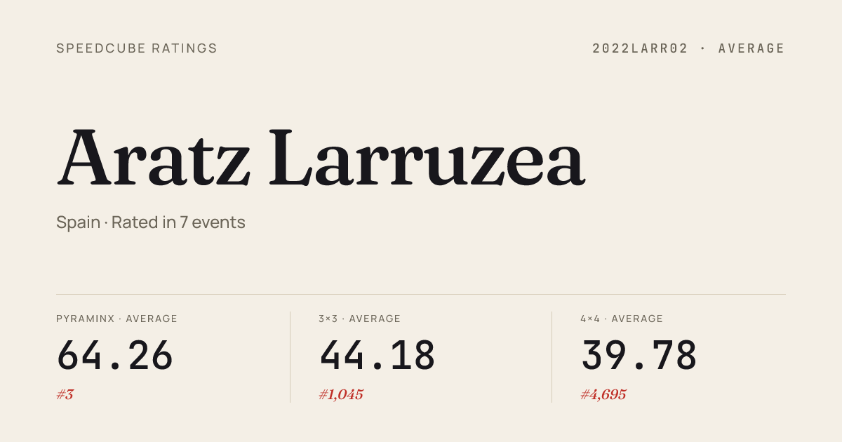 Apr 12, 20264x4x4 Cube · FinalGetafeOpen2026 · 9th45.46Apr 12, 2026Pyraminx · Round 1GetafeOpen2026 · 1st2.03Apr 12, 2026Pyraminx · FinalGetafeOpen2026 · 1st1.55Apr 12, 2026Skewb · FinalGetafeOpen2026 · 9th5.63Apr 12, 2026Skewb · Round 1GetafeOpen2026 · 10th5.24Mar 29, 20262x2x2 Cube · Round 1UrnietaOpen2026 · 2nd2.28Mar 29, 20262x2x2 Cube · Round 2UrnietaOpen2026 · 14th4.75Mar 29, 20263x3x3 Cube · Round 1UrnietaOpen2026 · 2nd8.01Mar 29, 20263x3x3 Cube · Round 2UrnietaOpen2026 · 2nd8.65Mar 29, 20263x3x3 Cube · FinalUrnietaOpen2026 · 3rd8.96Mar 29, 20263x3x3 One-Handed · Combined FinalUrnietaOpen2026 · 14th26.11Mar 29, 20264x4x4 Cube · Round 1UrnietaOpen2026 · 13th49.83Mar 29, 2026Pyraminx · Round 1UrnietaOpen2026 · 1st1.54Mar 29, 2026Pyraminx · Round 2UrnietaOpen2026 · 1st2.00Mar 29, 2026Pyraminx · FinalUrnietaOpen2026 · 1st2.32Mar 29, 2026Skewb · Round 2UrnietaOpen2026 · 8th5.36Mar 29, 2026Skewb · FinalUrnietaOpen2026 · 6th4.61Mar 29, 2026Skewb · Round 1UrnietaOpen2026 · 13th7.54Mar 1, 20262x2x2 Cube · Round 2PalenciaconPdePyraminx2026 · 5th3.37