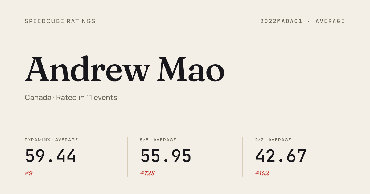 Mar 14, 2026Pyraminx · FinalWesternOntarioWinter2026 · 1st1.77Nov 29, 20255x5x5 Cube · Combined FinalWaterlooFall2025 · 6th1:04.02Nov 29, 2025Skewb · Round 1WaterlooFall2025 · 4th4.89Nov 29, 2025Skewb · FinalWaterlooFall2025 · 2nd4.13Nov 22, 2025Pyraminx · Round 1KawarthaFall2025 · 1st2.13Nov 22, 2025Pyraminx · FinalKawarthaFall2025 · 2nd2.44Nov 22, 2025Square-1 · Combined FinalKawarthaFall2025 · 5th16.59Nov 1, 20252x2x2 Cube · FinalPickeringFavouritesFall2025 · 2nd2.15Nov 1, 20255x5x5 Cube · Combined FinalPickeringFavouritesFall2025 · 5th1:01.56Nov 1, 2025Megaminx · Combined FinalPickeringFavouritesFall2025 · 8th59.18Nov 1, 2025Pyraminx · FinalPickeringFavouritesFall2025 · 1st1.69Oct 11, 20252x2x2 Cube · FinalClocktoberClassicNY2025 · 3rd2.20Oct 11, 2025Pyraminx · FinalClocktoberClassicNY2025 · 1st1.66Oct 11, 2025Pyraminx · Round 1ClocktoberClassicNY2025 · 1st1.87Sep 13, 20252x2x2 Cube · FinalBrantfordFall2025 · 11th1.07Sep 13, 20252x2x2 Cube · Round 1BrantfordFall2025 · 3rd2.12Sep 13, 2025Pyraminx · Round 1BrantfordFall2025 · 1st1.87Sep 13, 2025Pyraminx · FinalBrantfordFall2025 · 3rd2.97Sep 13, 2025Skewb · Round 1BrantfordFall2025 · 2nd3.11