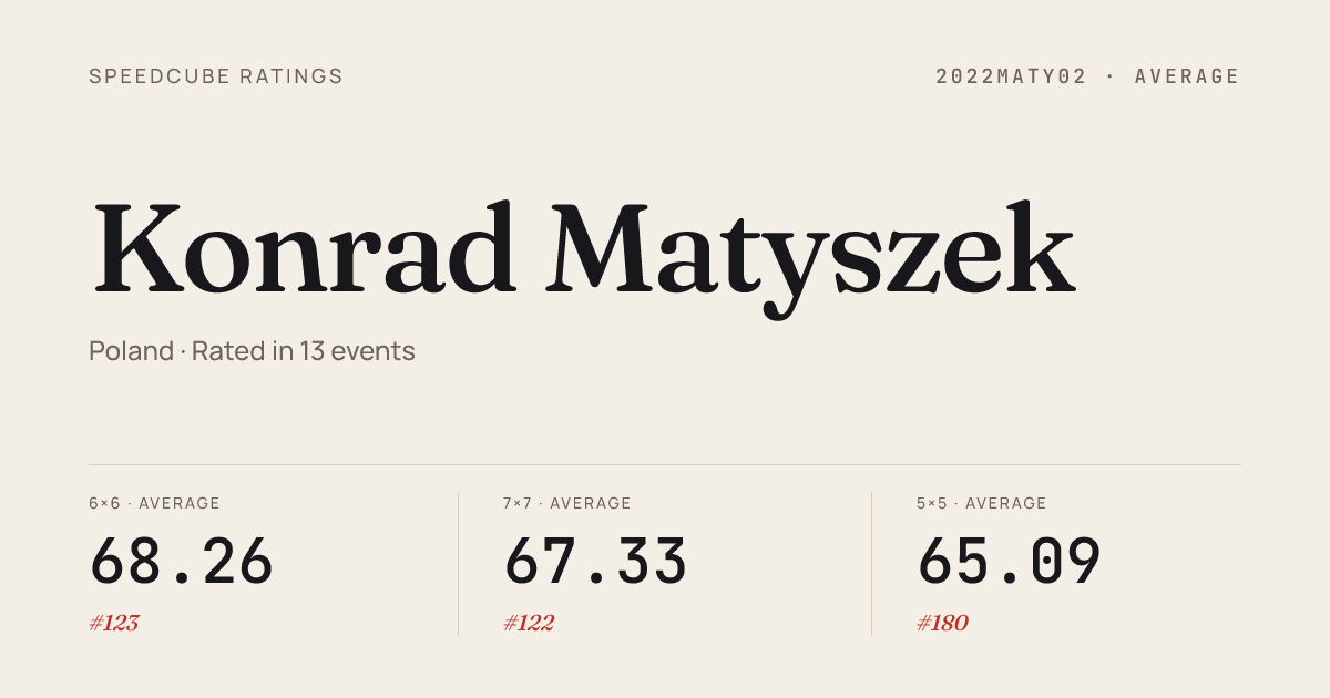 - Apr 19, 20263x3x3 Cube · FinalCubeFactoryLeagueJezow2026 · 5th7.23