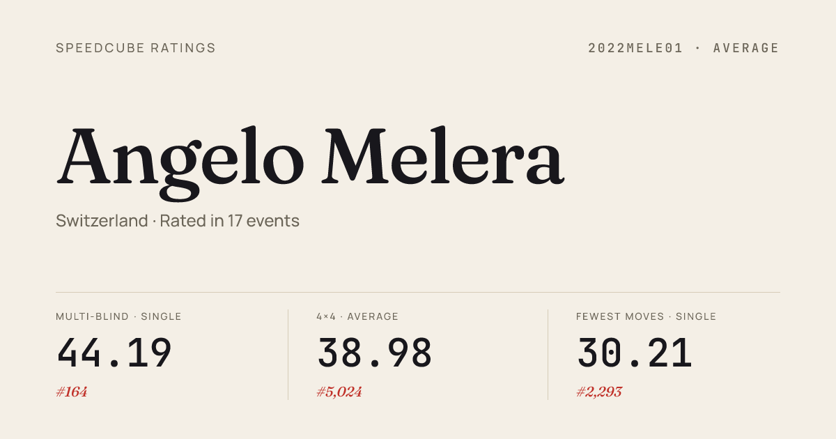 Nov 23, 20254x4x4 Cube · FinalLaFilandaSpeedcubing2025 · 7th44.61Nov 23, 20254x4x4 Cube · Round 2LaFilandaSpeedcubing2025 · 9th47.76Nov 23, 20254x4x4 Cube · Round 1LaFilandaSpeedcubing2025 · 9th50.50Nov 23, 2025Clock · Round 1LaFilandaSpeedcubing2025 · 27th30.27Nov 23, 2025Megaminx · FinalLaFilandaSpeedcubing2025 · 14th2:11.85Nov 23, 2025Megaminx · Round 1LaFilandaSpeedcubing2025 · 16th2:09.03Nov 23, 2025Pyraminx · Round 1LaFilandaSpeedcubing2025 · 33rd23.34Nov 23, 2025Skewb · Round 1LaFilandaSpeedcubing2025 · 29th33.12Sep 10, 20253x3x3 Blindfolded · FinalRedCrossRushHour2025 · 7th1:42.40Sep 10, 20255x5x5 Cube · FinalRedCrossRushHour2025 · 24th1:43.19Sep 10, 2025Square-1 · FinalRedCrossRushHour2025 · 18th1:21.84Feb 16, 20252x2x2 Cube · FinalSwisscubingCupII2025 · 31st6.39Feb 16, 20252x2x2 Cube · Round 1SwisscubingCupII2025 · 49th8.40Feb 16, 20253x3x3 Cube · Round 1SwisscubingCupII2025 · 29th17.22Feb 16, 20253x3x3 Cube · Round 2SwisscubingCupII2025 · 26th15.87Feb 16, 20253x3x3 Cube · FinalSwisscubingCupII2025 · 27th16.15Feb 16, 20255x5x5 Cube · Round 1SwisscubingCupII2025 · 17th1:42.80Feb 16, 20255x5x5 Cube · FinalSwisscubingCupII2025 · 18th1:51.02Feb 16, 20255x5x5 Cube · Round 2SwisscubingCupII2025 · 18th1:47.90