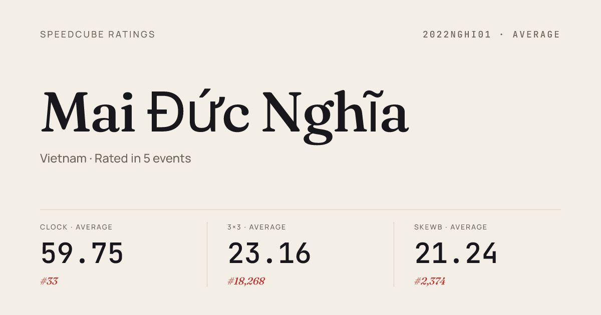 Sep 21, 2025Clock · FinalHanoiSummer2025 · 1st3.53Sep 21, 2025Megaminx · Combined FinalHanoiSummer2025 · 22nd1:44.12Sep 21, 2025Pyraminx · Round 1HanoiSummer2025 · 18th7.62Sep 21, 2025Skewb · FinalHanoiSummer2025 · 15th6.89Sep 21, 2025Skewb · Round 1HanoiSummer2025 · 10th5.29Sep 21, 2025Square-1 · Round 1HanoiSummer2025 · 24th39.27Dec 15, 20242x2x2 Cube · Round 1HanoiWinter2024 · 17th4.57Dec 15, 20242x2x2 Cube · Round 2HanoiWinter2024 · 24th4.73Dec 15, 20243x3x3 Cube · Round 1HanoiWinter2024 · 58th16.66Dec 15, 20243x3x3 One-Handed · Round 1HanoiWinter2024 · 41st50.19Dec 15, 2024Clock · FinalHanoiWinter2024 · 2nd4.42Dec 15, 2024Clock · Round 1HanoiWinter2024 · 3rd5.47Dec 15, 2024Pyraminx · Round 1HanoiWinter2024 · 7th6.98Dec 15, 2024Pyraminx · FinalHanoiWinter2024 · 9th7.46Dec 15, 2024Skewb · Round 1HanoiWinter2024 · 9th7.91Dec 15, 2024Skewb · FinalHanoiWinter2024 · 6th7.83Aug 10, 2024Clock · Round 1BlindTillNineinVietnam2024 · 2nd5.52Aug 10, 2024Clock · FinalBlindTillNineinVietnam2024 · 1st5.63Jul 21, 20242x2x2 Cube · Round 2VietnamChampionship2024 · national · 40th4.84
