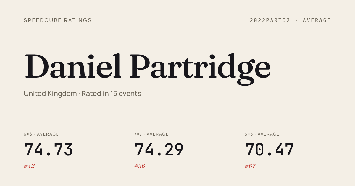 Apr 19, 20263x3x3 Cube · Round 2LiverpoolSpring2026 · 2nd7.09Apr 19, 20263x3x3 Blindfolded · FinalLiverpoolSpring2026 · 2nd49.03Apr 19, 20263x3x3 One-Handed · FinalLiverpoolSpring2026 · 4th14.99Apr 19, 20263x3x3 One-Handed · Round 1LiverpoolSpring2026 · 5th15.70Apr 19, 20264x4x4 Cube · FinalLiverpoolSpring2026 · 3rd30.44Apr 19, 20264x4x4 Cube · Round 1LiverpoolSpring2026 · 2nd28.19Apr 19, 20265x5x5 Cube · Round 1LiverpoolSpring2026 · 2nd51.40Apr 19, 20265x5x5 Cube · FinalLiverpoolSpring2026 · 1st50.91Apr 19, 20266x6x6 Cube · Combined FinalLiverpoolSpring2026 · 1st1:26.92Apr 19, 2026Megaminx · Round 1LiverpoolSpring2026 · 2nd39.52Apr 19, 2026Megaminx · FinalLiverpoolSpring2026 · 2nd38.72Apr 19, 2026Pyraminx · Round 1LiverpoolSpring2026 · 2nd2.72Apr 19, 2026Pyraminx · FinalLiverpoolSpring2026 · 1st2.04Mar 22, 20262x2x2 Cube · Round 1CreweSpring2026 · 2nd1.62Mar 22, 20262x2x2 Cube · FinalCreweSpring2026 · 4th2.08Mar 22, 20263x3x3 Cube · Round 1CreweSpring2026 · 2nd6.98Mar 22, 20263x3x3 Cube · Round 2CreweSpring2026 · 2nd6.66Mar 22, 20263x3x3 Cube · FinalCreweSpring2026 · 2nd6.75Mar 22, 20263x3x3 Blindfolded · FinalCreweSpring2026 · 1st46.14