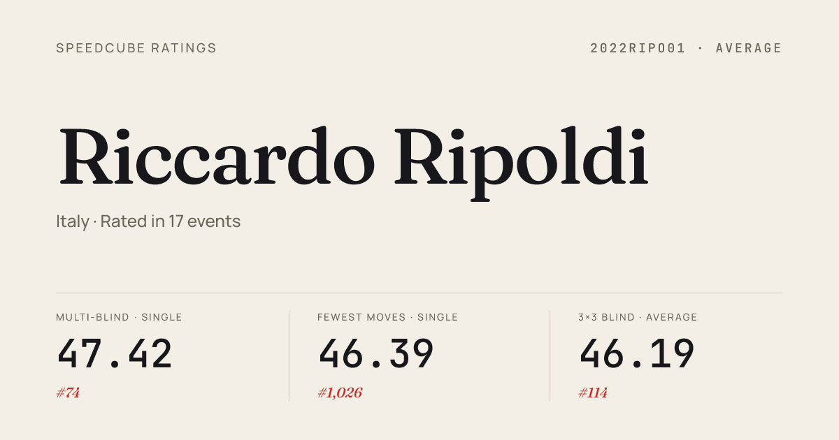- Dec 8, 20253x3x3 Cube · Round 2ItalianChampionship2025 · national · 150th16.13