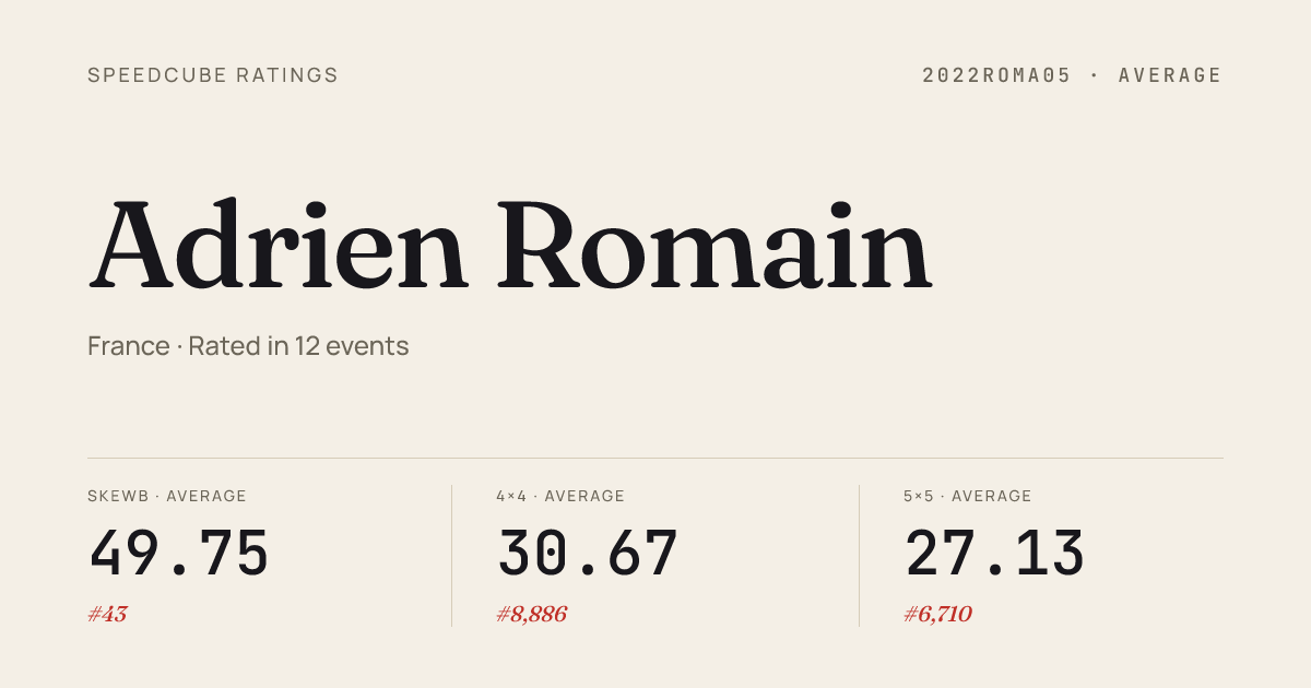 Apr 6, 2026Skewb · FinalFrenchChampionship2026 · national · 2nd3.00Feb 22, 20262x2x2 Cube · FinalChellesOpen2026 · 49th5.57Feb 22, 20262x2x2 Cube · Round 1ChellesOpen2026 · 36th4.48Feb 22, 20263x3x3 Cube · Round 2ChellesOpen2026 · 53rd13.37Feb 22, 20263x3x3 Cube · Round 1ChellesOpen2026 · 56th13.27Feb 22, 20263x3x3 Blindfolded · Round 1ChellesOpen2026 · 26th2:54.36Feb 22, 20264x4x4 Cube · Round 1ChellesOpen2026 · 51st56.43Feb 22, 2026Clock · Round 1ChellesOpen2026 · 51st18.95Feb 22, 2026Skewb · Round 1ChellesOpen2026 · 6th3.88Feb 22, 2026Skewb · Round 2ChellesOpen2026 · 2nd2.95Feb 22, 2026Skewb · FinalChellesOpen2026 · 1st2.66Feb 15, 20263x3x3 Cube · FinalCoeurdeCubeCharantonnay2026 · 49th18.68Feb 15, 20263x3x3 One-Handed · Round 1CoeurdeCubeCharantonnay2026 · 33rd30.54Feb 15, 2026Skewb · FinalCoeurdeCubeCharantonnay2026 · 3rd4.57Jan 25, 20263x3x3 Cube · Round 1IstresOpen2026 · 11th12.62Jan 25, 20263x3x3 Cube · FinalIstresOpen2026 · 10th14.70Jan 25, 20263x3x3 Cube · Round 2IstresOpen2026 · 15th16.03Jan 25, 20264x4x4 Cube · Round 1IstresOpen2026 · 10th1:00.11Jan 25, 20265x5x5 Cube · Combined FinalIstresOpen2026 · 11th2:02.17Jan 25, 20267x7x7 Cube · FinalIstresOpen2026 · 9th7:02.89