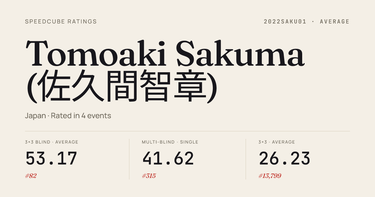 Mar 7, 20263x3x3 Multi-Blind · FinalTokyoBLDWinter2026 · 12th11/17 in 60:00Feb 21, 20263x3x3 Cube · Round 1KantoWinter2026 · 58th14.87Feb 21, 20263x3x3 Blindfolded · FinalKantoWinter2026 · 8th24.43Feb 21, 20263x3x3 Blindfolded · Round 1KantoWinter2026 · 8th28.53Feb 21, 20264x4x4 Cube · Round 1KantoWinter2026 · 55th1:15.32Nov 8, 20253x3x3 Blindfolded · FinalOtaBLDAutumn2025 · 6th26.30Nov 8, 20253x3x3 Blindfolded · Round 1OtaBLDAutumn2025 · 2nd23.55Nov 8, 20253x3x3 Multi-Blind · FinalOtaBLDAutumn2025 · 7th11/14 in 55:51Oct 11, 20253x3x3 Cube · Round 1KantoAutumnAM2025 · 28th14.91Oct 11, 20253x3x3 Blindfolded · FinalKantoAutumnAM2025 · 5th36.95Oct 11, 20253x3x3 Blindfolded · Round 1KantoAutumnAM2025 · 6th26.85Aug 30, 20253x3x3 Cube · Round 1KantoSummerPM2025 · 41st13.55Jul 27, 20253x3x3 Fewest Moves · FinalFMCAsia2025 · 286th53Jun 15, 20253x3x3 Cube · Round 2KansaiOddandBLD2025 · 89th14.13Jun 15, 20253x3x3 Cube · Round 1KansaiOddandBLD2025 · 97th14.84Jun 15, 20253x3x3 Blindfolded · Round 1KansaiOddandBLD2025 · 3rd22.63Jun 15, 20253x3x3 Blindfolded · FinalKansaiOddandBLD2025 · 8th28.79Jun 15, 20253x3x3 Multi-Blind · FinalKansaiOddandBLD2025 · 11th12/15 in 56:06May 10, 20253x3x3 Blindfolded · FinalTokyoBLDSpring2025 · 9th32.43May 10, 20253x3x3 Blindfolded · Round 1TokyoBLDSpring2025 · 5th31.05