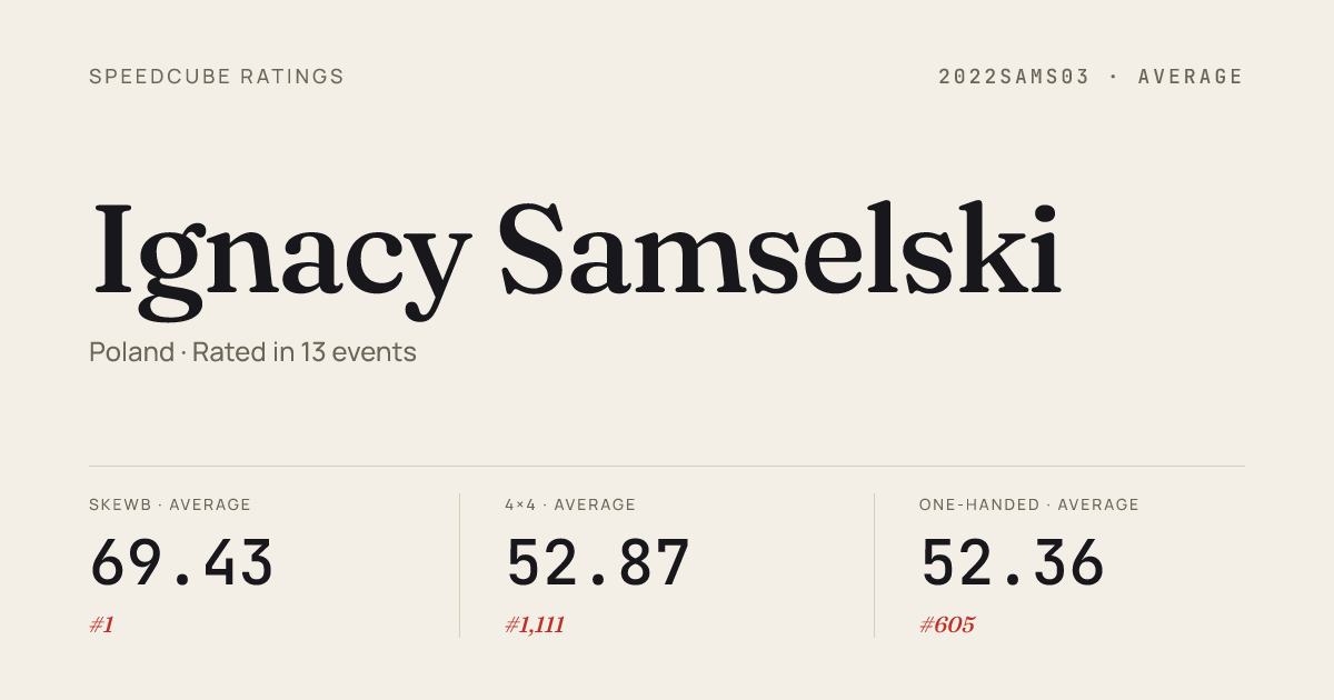 - Apr 19, 20263x3x3 Cube · FinalCubeFactoryLeagueJezow2026 · 9th8.41