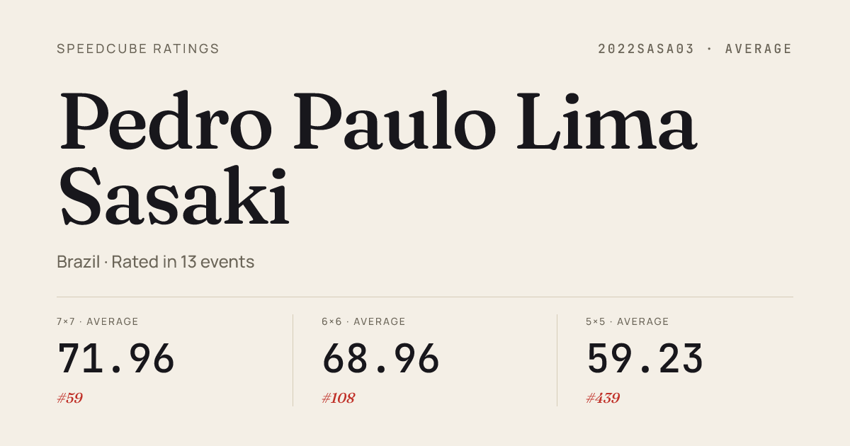 Mar 22, 20267x7x7 Cube · Combined FinalMegaGeekFestival2026 · 1st2:12.78Mar 22, 2026Clock · Combined FinalMegaGeekFestival2026 · 7th8.87Mar 22, 2026Megaminx · Combined FinalMegaGeekFestival2026 · 9th1:00.37Mar 22, 2026Skewb · Combined FinalMegaGeekFestival2026 · 12th7.85Mar 22, 2026Square-1 · Combined FinalMegaGeekFestival2026 · 12th27.04Nov 1, 20252x2x2 Cube · Combined FinalIIAquaticoAclimacaoOpen2025 · 12th4.89Nov 1, 20253x3x3 Cube · FinalIIAquaticoAclimacaoOpen2025 · 3rd9.71Nov 1, 20254x4x4 Cube · Combined FinalIIAquaticoAclimacaoOpen2025 · 3rd31.69Nov 1, 20255x5x5 Cube · Combined FinalIIAquaticoAclimacaoOpen2025 · 3rd58.07Nov 1, 20256x6x6 Cube · Combined FinalIIAquaticoAclimacaoOpen2025 · 1st1:34.16Nov 1, 20257x7x7 Cube · FinalIIAquaticoAclimacaoOpen2025 · 1st2:17.75Nov 1, 20257x7x7 Cube · Round 1IIAquaticoAclimacaoOpen2025 · 1st2:15.03Nov 1, 2025Megaminx · Combined FinalIIAquaticoAclimacaoOpen2025 · 6th1:04.65Jul 20, 20252x2x2 Cube · Round 1CampeonatoBrasileiro2025 · national · 29th4.26Jul 20, 20252x2x2 Cube · Round 2CampeonatoBrasileiro2025 · national · 13th3.47Jul 20, 20253x3x3 Cube · Round 1CampeonatoBrasileiro2025 · national · 10th9.37Jul 20, 20253x3x3 Cube · Semi-FinalCampeonatoBrasileiro2025 · national · 16th9.86Jul 20, 20253x3x3 Cube · Round 2CampeonatoBrasileiro2025 · national · 5th9.15Jul 20, 20253x3x3 One-Handed · Round 2CampeonatoBrasileiro2025 · national · 25th21.78