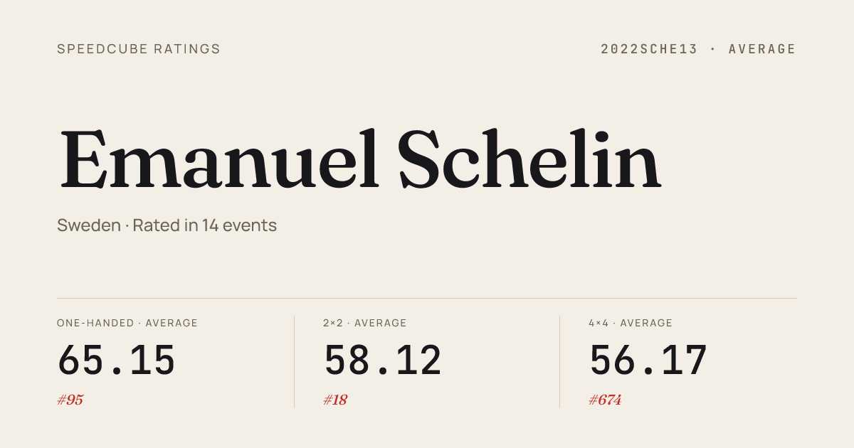 Apr 18, 20263x3x3 Blindfolded · FinalKublordagJonkopingXI2026 · 7th3:33.66Apr 18, 20263x3x3 One-Handed · Combined FinalKublordagJonkopingXI2026 · 1st12.64Apr 18, 2026Pyraminx · FinalKublordagJonkopingXI2026 · 2nd4.34Apr 18, 2026Square-1 · Combined FinalKublordagJonkopingXI2026 · 1st14.25Mar 29, 20262x2x2 Cube · FinalKalmarCubing2026 · 2nd2.06Mar 29, 20262x2x2 Cube · Round 1KalmarCubing2026 · 1st1.09Mar 29, 20262x2x2 Cube · Round 2KalmarCubing2026 · 1st1.75Mar 29, 20263x3x3 Cube · Round 1KalmarCubing2026 · 1st7.51Mar 29, 20263x3x3 Cube · Round 2KalmarCubing2026 · 2nd7.80Mar 29, 20263x3x3 Cube · FinalKalmarCubing2026 · 1st6.30Mar 29, 20263x3x3 Fewest Moves · FinalKalmarCubing2026 · 1st33Mar 29, 20263x3x3 One-Handed · Round 1KalmarCubing2026 · 1st11.40Mar 29, 20263x3x3 One-Handed · FinalKalmarCubing2026 · 1st10.53Mar 29, 20264x4x4 Cube · Round 1KalmarCubing2026 · 1st34.65Mar 29, 20264x4x4 Cube · FinalKalmarCubing2026 · 1st32.60Mar 29, 20265x5x5 Cube · Round 1KalmarCubing2026 · 1st1:01.77Mar 29, 20265x5x5 Cube · FinalKalmarCubing2026 · 2nd1:01.47Mar 29, 20266x6x6 Cube · Combined FinalKalmarCubing2026 · 2nd2:24.16Mar 29, 20267x7x7 Cube · Combined FinalKalmarCubing2026 · 3rd4:00.01