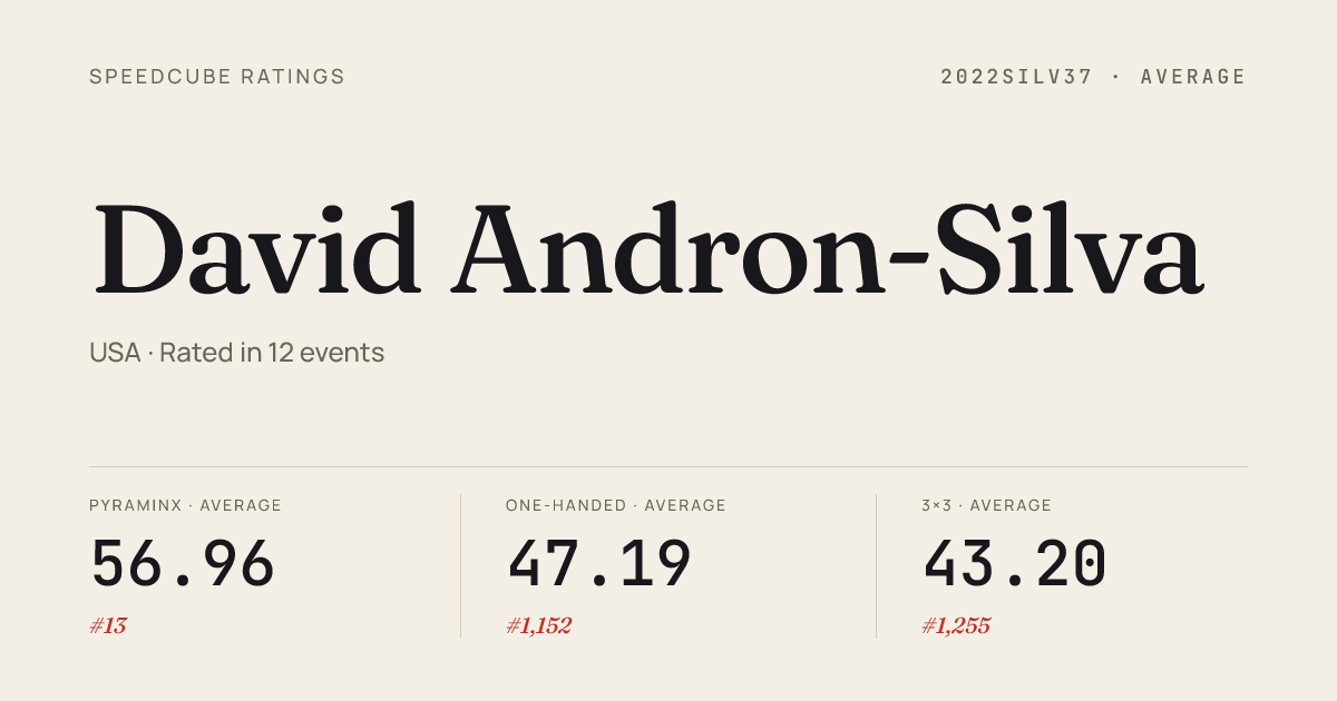 - Apr 4, 20263x3x3 One-Handed · Round 1WakefieldMASpring2026 · 8th16.23