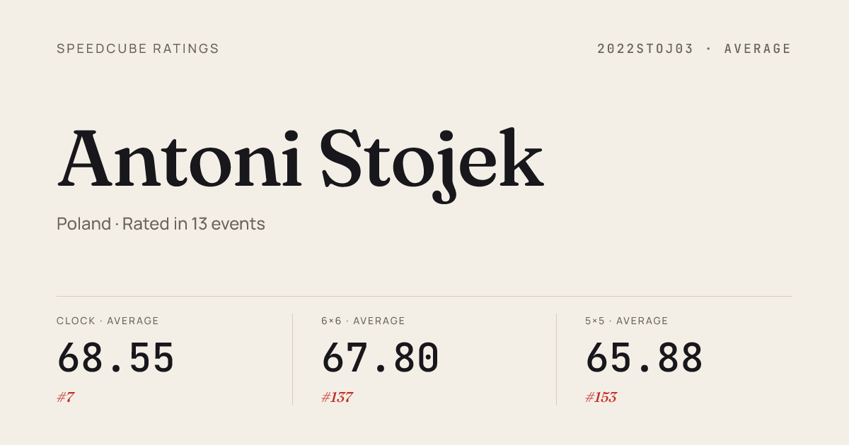 - Apr 19, 20263x3x3 Cube · FinalCubeFactoryLeagueJezow2026 · 3rd6.74