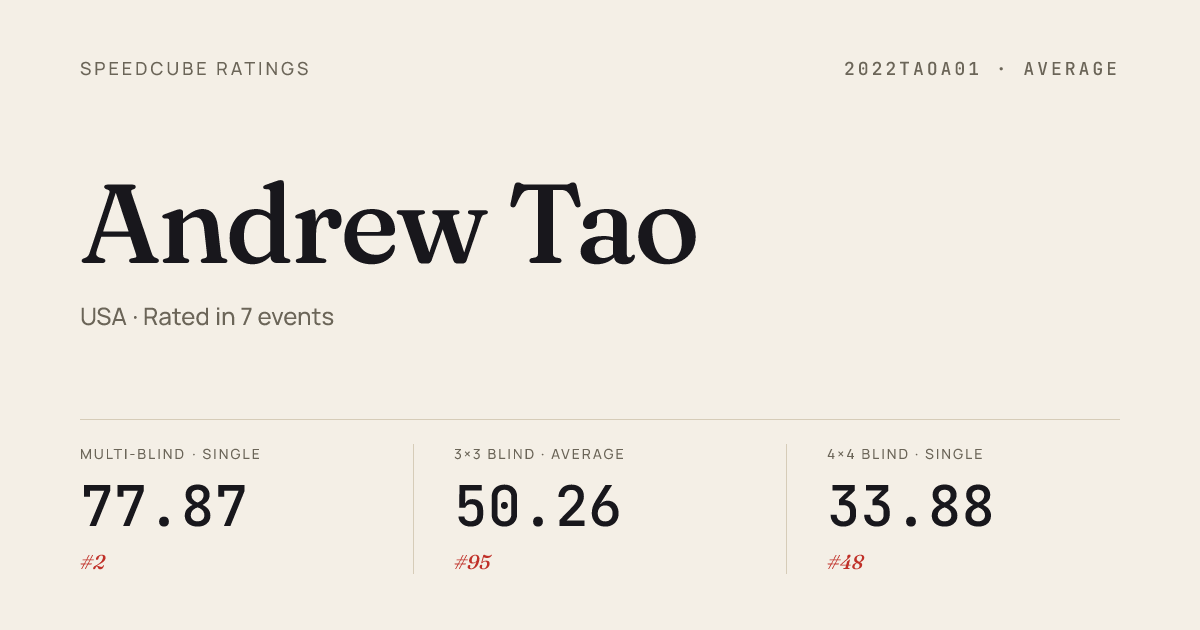 Mar 21, 20263x3x3 Blindfolded · Round 1ManhattanMegaminxMayhem2026 · 1st17.06Jan 18, 20263x3x3 Blindfolded · FinalNoSprintingNY2026 · 1st19.13Jan 18, 20263x3x3 Blindfolded · Round 1NoSprintingNY2026 · 1st20.54Jan 18, 20263x3x3 Multi-Blind · FinalNoSprintingNY2026 · 2nd52/63 in 60:00Jan 4, 20263x3x3 Blindfolded · Round 1MultiMayhemVA2026 · 7th30.33Jan 4, 20263x3x3 Blindfolded · FinalMultiMayhemVA2026 · 6th20.98Jan 4, 20263x3x3 Multi-Blind · Round 1MultiMayhemVA2026 · 1st56/60 in 58:43Jan 4, 20263x3x3 Multi-Blind · FinalMultiMayhemVA2026 · 1st57/61 in 60:00Jan 4, 20264x4x4 Blindfolded · FinalMultiMayhemVA2026 · 5th2:39.01Jan 4, 20264x4x4 Blindfolded · Round 1MultiMayhemVA2026 · 6th2:48.38Jan 4, 20265x5x5 Blindfolded · Round 1MultiMayhemVA2026 · 4th6:01.04Nov 2, 20253x3x3 Blindfolded · FinalCubingUSAAllStars2025 · national · 5th19.04Nov 2, 20253x3x3 Multi-Blind · FinalCubingUSAAllStars2025 · national · 3rd51/57 in 58:15Sep 21, 20253x3x3 Blindfolded · Round 1DontDNSDenton2025 · 1st22.45Sep 21, 20253x3x3 Multi-Blind · FinalDontDNSDenton2025 · 1st50/57 in 60:00Sep 21, 20254x4x4 Blindfolded · FinalDontDNSDenton2025 · 1st2:16.05Sep 21, 20255x5x5 Blindfolded · FinalDontDNSDenton2025 · 1st5:15.96Sep 7, 20253x3x3 Blindfolded · FinalNewYorkQuietChampionship2025 · 2nd40.67Sep 7, 20253x3x3 Blindfolded · Round 2NewYorkQuietChampionship2025 · 2nd33.87Sep 7, 20253x3x3 Blindfolded · Round 1NewYorkQuietChampionship2025 · 2nd26.66