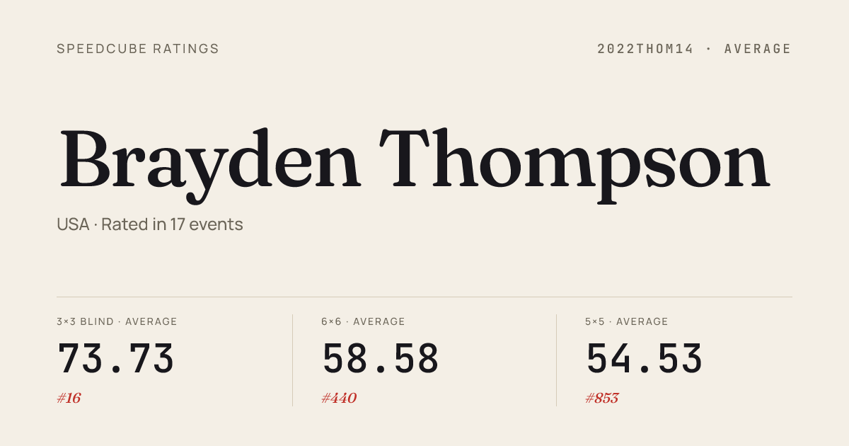 - Mar 21, 20263x3x3 Cube · Semi-FinalMachesneyParkSpring2026 · 10th8.95