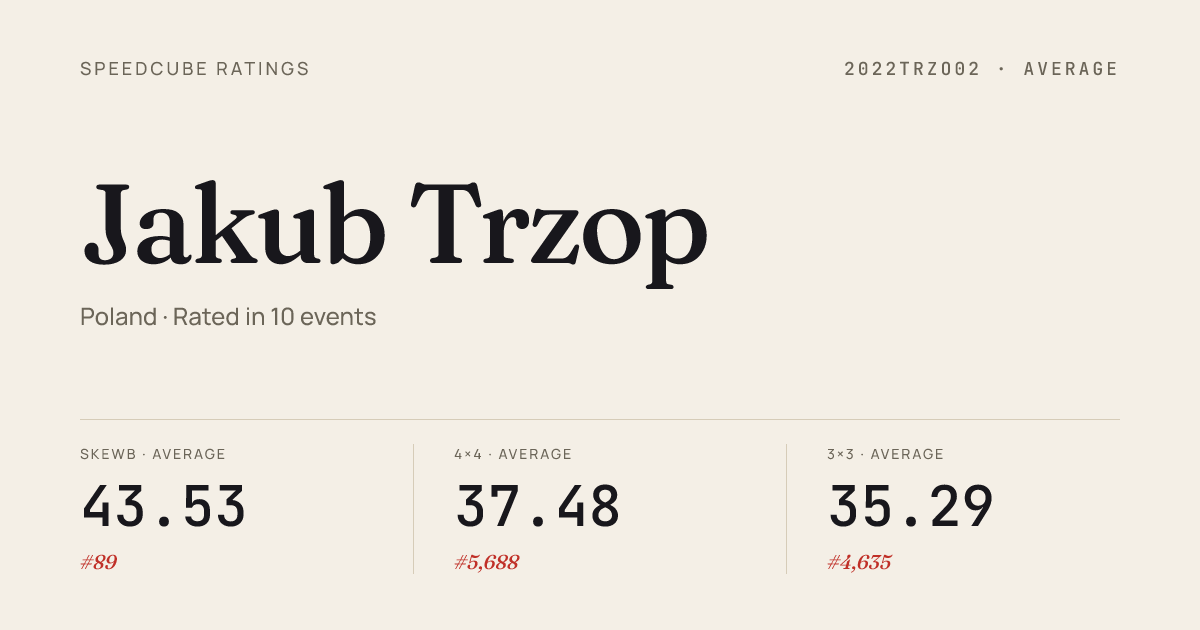 Mar 22, 20264x4x4 Cube · Combined FinalRuzomberokOpen2026 · 17th50.31Mar 22, 20264x4x4 Cube · Round 1RuzomberokOpen2026 · 14th45.70Mar 22, 20265x5x5 Cube · Round 1RuzomberokOpen2026 · 25th2:24.33Mar 22, 2026Clock · Round 1RuzomberokOpen2026 · 19th9.97Mar 22, 2026Megaminx · Round 1RuzomberokOpen2026 · 17th1:46.34Mar 22, 2026Pyraminx · Round 1RuzomberokOpen2026 · 24th8.93Mar 22, 2026Skewb · FinalRuzomberokOpen2026 · 3rd3.20Mar 22, 2026Skewb · Round 1RuzomberokOpen2026 · 4th3.33Mar 22, 2026Skewb · Round 2RuzomberokOpen2026 · 2nd2.57Jan 25, 20262x2x2 Cube · Round 1Cube4funTylmanowaWinter2026 · 13th3.69Jan 25, 20263x3x3 Cube · Round 2Cube4funTylmanowaWinter2026 · 21st11.68Jan 25, 20263x3x3 Cube · Round 1Cube4funTylmanowaWinter2026 · 14th10.20Jan 25, 20263x3x3 One-Handed · Round 1Cube4funTylmanowaWinter2026 · 16th21.37Jan 25, 20264x4x4 Cube · Round 1Cube4funTylmanowaWinter2026 · 23rd54.67Jan 25, 20265x5x5 Cube · Round 1Cube4funTylmanowaWinter2026 · 24th2:02.78Jan 25, 2026Megaminx · Round 1Cube4funTylmanowaWinter2026 · 22nd1:47.76Jan 25, 2026Pyraminx · Round 1Cube4funTylmanowaWinter2026 · 24th8.17Jan 25, 2026Skewb · FinalCube4funTylmanowaWinter2026 · 7th3.55Jan 25, 2026Skewb · Round 1Cube4funTylmanowaWinter2026 · 3rd3.32