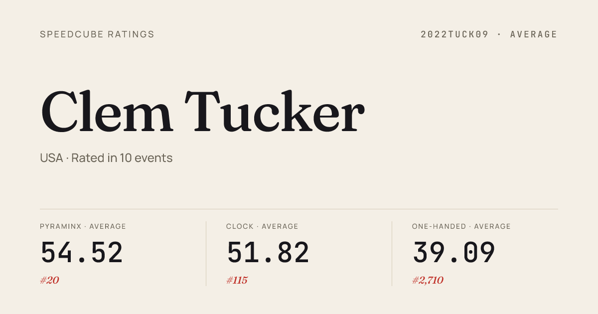 Apr 4, 2026Pyraminx · FinalPBsinPalisadesSpring2026 · 3rd2.28Apr 4, 2026Pyraminx · Round 1PBsinPalisadesSpring2026 · 1st1.50Apr 4, 2026Pyraminx · Round 2PBsinPalisadesSpring2026 · 1st1.80Mar 8, 20263x3x3 Cube · Round 2EmpireStateALL11Stars2026 · 9th9.30Mar 8, 20263x3x3 Cube · FinalEmpireStateALL11Stars2026 · 16th12.22Mar 8, 20263x3x3 Cube · Round 1EmpireStateALL11Stars2026 · 19th10.76Mar 8, 20263x3x3 One-Handed · FinalEmpireStateALL11Stars2026 · 13th18.20Mar 8, 20263x3x3 One-Handed · Round 1EmpireStateALL11Stars2026 · 15th19.09Mar 8, 20264x4x4 Cube · Round 1EmpireStateALL11Stars2026 · 16th40.10Mar 8, 20264x4x4 Cube · FinalEmpireStateALL11Stars2026 · 15th45.15Mar 8, 2026Clock · Round 1EmpireStateALL11Stars2026 · 3rd5.64Mar 8, 2026Clock · FinalEmpireStateALL11Stars2026 · 3rd3.74Mar 8, 2026Clock · Round 2EmpireStateALL11Stars2026 · 6th4.93Mar 8, 2026Pyraminx · Round 1EmpireStateALL11Stars2026 · 1st1.85Mar 8, 2026Pyraminx · FinalEmpireStateALL11Stars2026 · 3rd2.40Feb 21, 20263x3x3 Cube · Round 2PBsinPalisadesOpen2026 · 34th10.77Feb 21, 20263x3x3 Cube · Round 1PBsinPalisadesOpen2026 · 31st10.87Feb 21, 20264x4x4 Cube · Round 1PBsinPalisadesOpen2026 · 49th55.63Feb 21, 2026Clock · FinalPBsinPalisadesOpen2026 · 4th4.22