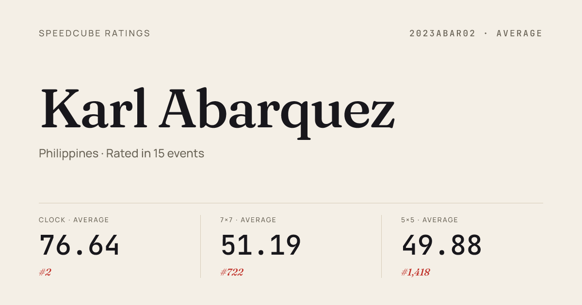 Apr 11, 20264x4x4 Cube · Combined FinalSouthLuzonChampionship2026 · 6th37.12Apr 11, 20267x7x7 Cube · Round 1SouthLuzonChampionship2026 · 4th3:06.77Apr 11, 20267x7x7 Cube · FinalSouthLuzonChampionship2026 · 4th3:10.09Apr 11, 2026Clock · Combined FinalSouthLuzonChampionship2026 · 1st2.99Apr 11, 2026Megaminx · Combined FinalSouthLuzonChampionship2026 · 2nd47.18Apr 11, 2026Pyraminx · Combined FinalSouthLuzonChampionship2026 · 4th3.91Apr 11, 2026Skewb · Combined FinalSouthLuzonChampionship2026 · 1st3.55Mar 28, 20262x2x2 Cube · Combined FinalPinoyBigCubesOpen2026 · 9th4.07Mar 28, 20263x3x3 Cube · Combined FinalPinoyBigCubesOpen2026 · 8th10.45Mar 28, 20264x4x4 Cube · Combined FinalPinoyBigCubesOpen2026 · 10th39.79Mar 28, 20265x5x5 Cube · FinalPinoyBigCubesOpen2026 · 8th1:04.92Mar 28, 20265x5x5 Cube · Round 1PinoyBigCubesOpen2026 · 11th1:08.77Mar 28, 20266x6x6 Cube · Round 1PinoyBigCubesOpen2026 · 11th2:08.03Mar 28, 20266x6x6 Cube · FinalPinoyBigCubesOpen2026 · 10th2:16.00Mar 28, 20267x7x7 Cube · FinalPinoyBigCubesOpen2026 · 9th3:18.58Mar 28, 20267x7x7 Cube · Round 1PinoyBigCubesOpen2026 · 12th3:15.18Mar 28, 20267x7x7 Cube · Round 2PinoyBigCubesOpen2026 · 10th3:00.59Feb 28, 20262x2x2 Cube · Combined FinalPinoySideEventsOpen2026 · 31st5.74Feb 28, 20263x3x3 Cube · Round 1PinoySideEventsOpen2026 · 10th9.38Feb 28, 20263x3x3 Cube · FinalPinoySideEventsOpen2026 · 9th9.37