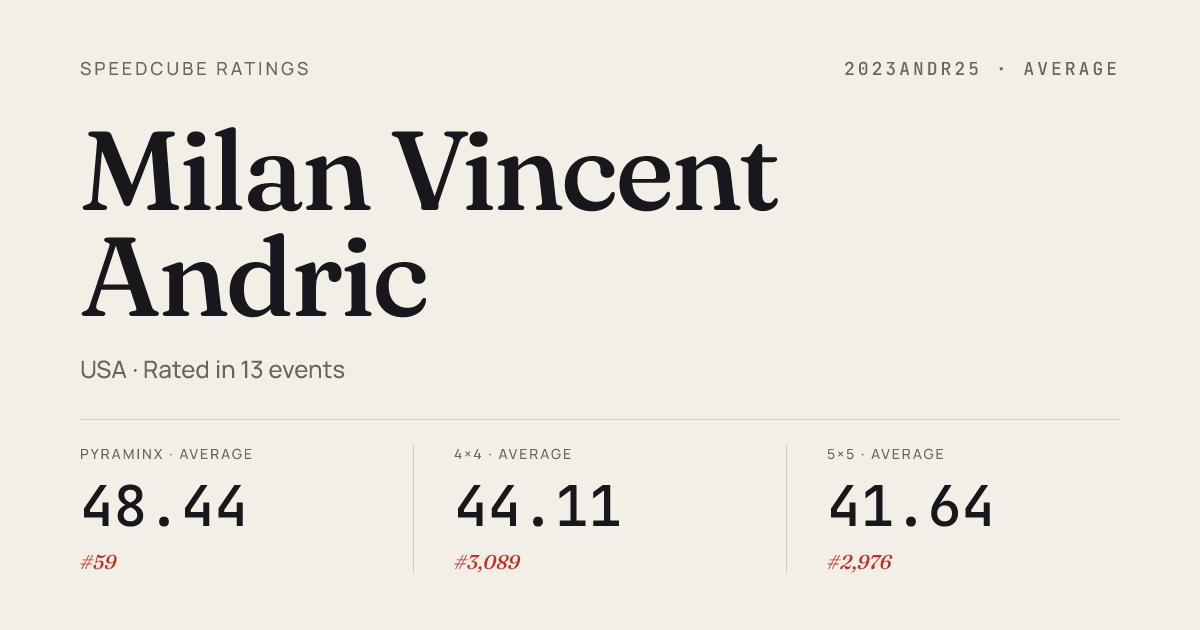 Apr 11, 2026Skewb · FinalEphrataSpring2026 · 1st3.17Apr 11, 2026Skewb · Round 1EphrataSpring2026 · 2nd3.52Apr 11, 2026Square-1 · Round 1EphrataSpring2026 · 11th29.80Apr 5, 20262x2x2 Cube · Round 1NYUSpring2026 · 7th2.83Apr 5, 20262x2x2 Cube · FinalNYUSpring2026 · 2nd1.91Apr 5, 20263x3x3 Cube · FinalNYUSpring2026 · 3rd7.56Apr 5, 20263x3x3 Cube · Round 1NYUSpring2026 · 13th9.32Apr 5, 20263x3x3 Cube · Round 2NYUSpring2026 · 12th9.21Apr 5, 20264x4x4 Cube · Combined FinalNYUSpring2026 · 21st42.86Apr 5, 20265x5x5 Cube · Combined FinalNYUSpring2026 · 17th1:20.03Apr 4, 20263x3x3 Cube · Round 2PBsinPalisadesSpring2026 · 21st10.31Apr 4, 20263x3x3 Cube · Round 1PBsinPalisadesSpring2026 · 17th9.72Apr 4, 20264x4x4 Cube · Round 1PBsinPalisadesSpring2026 · 15th38.50Apr 4, 20264x4x4 Cube · FinalPBsinPalisadesSpring2026 · 19th42.24Apr 4, 2026Clock · Round 1PBsinPalisadesSpring2026 · 26th9.19Apr 4, 2026Clock · Round 2PBsinPalisadesSpring2026 · 19th7.63Apr 4, 2026Pyraminx · FinalPBsinPalisadesSpring2026 · 2nd2.17Apr 4, 2026Pyraminx · Round 2PBsinPalisadesSpring2026 · 3rd2.00Apr 4, 2026Pyraminx · Round 1PBsinPalisadesSpring2026 · 6th2.42