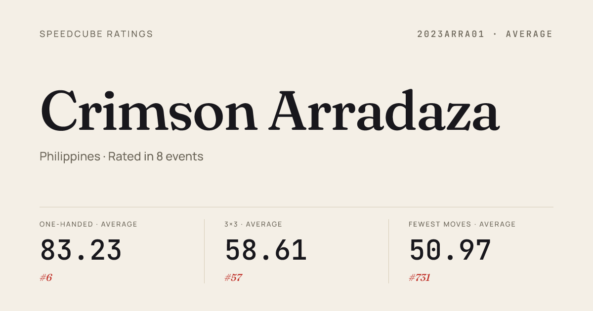 Mar 14, 20264x4x4 Cube · Combined FinalGANCUBEPiDayPampanga2026 · 14th43.55Mar 14, 20265x5x5 Cube · Combined FinalGANCUBEPiDayPampanga2026 · 9th1:11.71Jan 11, 20262x2x2 Cube · FinalLuzonChampionship2026 · 13th4.55Jan 11, 20262x2x2 Cube · Round 2LuzonChampionship2026 · 7th3.01Jan 11, 20262x2x2 Cube · Round 1LuzonChampionship2026 · 5th3.03Jan 11, 20263x3x3 Cube · Round 2LuzonChampionship2026 · 1st6.81Jan 11, 20263x3x3 Cube · FinalLuzonChampionship2026 · 1st6.08Jan 11, 20263x3x3 Cube · Round 1LuzonChampionship2026 · 2nd6.98Jan 11, 20263x3x3 Fewest Moves · FinalLuzonChampionship2026 · 6th35Jan 11, 20263x3x3 One-Handed · FinalLuzonChampionship2026 · 1st8.76Jan 11, 20263x3x3 One-Handed · Round 1LuzonChampionship2026 · 1st9.17Jan 11, 20264x4x4 Cube · Round 1LuzonChampionship2026 · 17th43.24Jan 11, 20264x4x4 Cube · FinalLuzonChampionship2026 · 11th40.09Jan 11, 20265x5x5 Cube · Round 1LuzonChampionship2026 · 12th1:14.86Jan 11, 20265x5x5 Cube · FinalLuzonChampionship2026 · 8th1:13.72Sep 14, 20252x2x2 Cube · Combined FinalPangasinanPuzzleParty2025 · 2nd3.43Sep 14, 20253x3x3 Cube · Round 2PangasinanPuzzleParty2025 · 1st6.56Sep 14, 20253x3x3 Cube · Round 1PangasinanPuzzleParty2025 · 1st6.17Sep 14, 20253x3x3 Cube · FinalPangasinanPuzzleParty2025 · 1st7.41Sep 14, 20253x3x3 One-Handed · Round 1PangasinanPuzzleParty2025 · 1st8.61