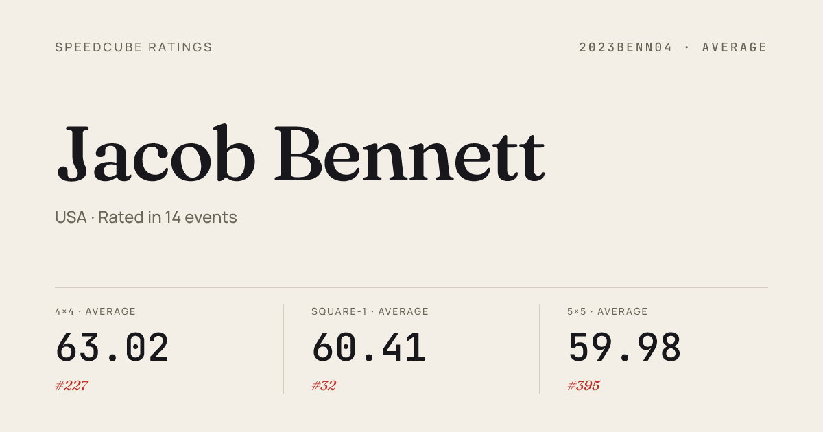 Jan 31, 20264x4x4 Cube · FinalLewisCenterSideEvents2026 · 3rd28.91Jan 31, 20264x4x4 Cube · Round 1LewisCenterSideEvents2026 · 3rd29.13Jan 31, 2026Pyraminx · Round 1LewisCenterSideEvents2026 · 4th2.62Jan 31, 2026Pyraminx · FinalLewisCenterSideEvents2026 · 2nd2.23Jan 31, 2026Square-1 · FinalLewisCenterSideEvents2026 · 1st7.40Jan 31, 2026Square-1 · Round 1LewisCenterSideEvents2026 · 1st7.34Jan 17, 20263x3x3 Cube · Round 1OhioStateWinter2026 · 3rd7.47Jan 17, 20263x3x3 Cube · Round 2OhioStateWinter2026 · 3rd7.50Jan 17, 20263x3x3 Cube · FinalOhioStateWinter2026 · 3rd7.09Jan 17, 20265x5x5 Cube · Combined FinalOhioStateWinter2026 · 2nd54.46Jan 17, 2026Square-1 · FinalOhioStateWinter2026 · 1st7.59Jan 17, 2026Square-1 · Round 1OhioStateWinter2026 · 1st7.40Dec 21, 20252x2x2 Cube · Round 2OhioChampionship2025 · 4th2.11Dec 21, 20252x2x2 Cube · Round 1OhioChampionship2025 · 3rd1.83Dec 21, 20252x2x2 Cube · FinalOhioChampionship2025 · 14th3.68Dec 21, 20253x3x3 Cube · FinalOhioChampionship2025 · 10th8.43Dec 21, 20253x3x3 Cube · Round 2OhioChampionship2025 · 3rd7.55Dec 21, 20253x3x3 Cube · Round 1OhioChampionship2025 · 3rd7.03Dec 21, 20253x3x3 Cube · Semi-FinalOhioChampionship2025 · 10th8.32