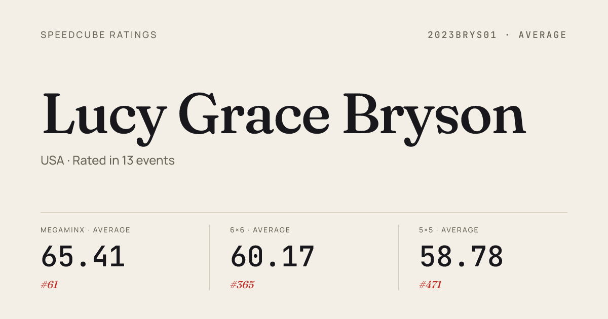 Apr 12, 20264x4x4 Cube · FinalOberliNxN2026 · 3rd31.38Apr 12, 20264x4x4 Cube · Round 1OberliNxN2026 · 3rd32.05Apr 12, 20265x5x5 Cube · Round 1OberliNxN2026 · 4th1:00.25Apr 12, 20265x5x5 Cube · FinalOberliNxN2026 · 3rd55.90Apr 12, 20266x6x6 Cube · FinalOberliNxN2026 · 2nd1:42.97Apr 12, 20266x6x6 Cube · Round 1OberliNxN2026 · 3rd1:46.70Apr 12, 20266x6x6 Cube · Round 2OberliNxN2026 · 2nd1:44.54Apr 12, 20267x7x7 Cube · FinalOberliNxN2026 · 3rd2:43.20Apr 12, 20267x7x7 Cube · Round 2OberliNxN2026 · 3rd2:35.73Apr 12, 20267x7x7 Cube · Round 1OberliNxN2026 · 2nd2:29.42Apr 4, 20262x2x2 Cube · FinalUIUCSpring2026 · 4th2.71Apr 4, 20262x2x2 Cube · Round 1UIUCSpring2026 · 8th3.24Apr 4, 20262x2x2 Cube · Round 2UIUCSpring2026 · 8th3.41Apr 4, 20263x3x3 Cube · FinalUIUCSpring2026 · 10th9.08Apr 4, 20263x3x3 Cube · Round 1UIUCSpring2026 · 9th9.83Apr 4, 20263x3x3 Cube · Round 2UIUCSpring2026 · 11th10.70Apr 4, 20263x3x3 One-Handed · Round 1UIUCSpring2026 · 9th18.66Apr 4, 20263x3x3 One-Handed · FinalUIUCSpring2026 · 6th15.93Apr 4, 20264x4x4 Cube · FinalUIUCSpring2026 · 9th35.15