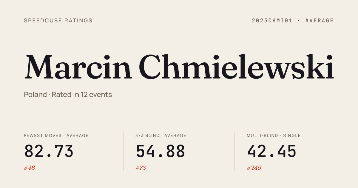 Mar 15, 20263x3x3 Blindfolded · FinalCubeFactoryLeagueRogow2026 · 4th21.32Mar 15, 20263x3x3 One-Handed · Round 1CubeFactoryLeagueRogow2026 · 36th26.55Mar 15, 20264x4x4 Cube · Round 1CubeFactoryLeagueRogow2026 · 46th52.85Mar 15, 2026Clock · Round 1CubeFactoryLeagueRogow2026 · 56th12.83Mar 15, 2026Megaminx · Round 1CubeFactoryLeagueRogow2026 · 32nd1:16.71Mar 15, 2026Pyraminx · Round 1CubeFactoryLeagueRogow2026 · 58th10.08Mar 15, 2026Skewb · Round 1CubeFactoryLeagueRogow2026 · 56th13.07Mar 8, 20263x3x3 Blindfolded · Round 2BrizZonSideOpenII2026 · 4th23.00Mar 8, 20263x3x3 Blindfolded · Round 1BrizZonSideOpenII2026 · 5th20.35Mar 8, 20263x3x3 Blindfolded · FinalBrizZonSideOpenII2026 · 2nd17.20Mar 8, 20263x3x3 Multi-Blind · FinalBrizZonSideOpenII2026 · 6th17/20 in 57:23Mar 8, 2026Megaminx · Round 1BrizZonSideOpenII2026 · 18th1:27.40Feb 22, 20263x3x3 Blindfolded · FinalCFGoesSidewaysBrzeziny2026 · 2nd21.70Feb 22, 20263x3x3 Blindfolded · Round 1CFGoesSidewaysBrzeziny2026 · 3rd25.37Feb 22, 20263x3x3 Blindfolded · Round 2CFGoesSidewaysBrzeziny2026 · 3rd25.71Feb 22, 20263x3x3 Multi-Blind · FinalCFGoesSidewaysBrzeziny2026 · 8th12/16 in 40:46Feb 22, 2026Clock · Round 1CFGoesSidewaysBrzeziny2026 · 15th15.66Feb 1, 20263x3x3 Blindfolded · FinalBrizZonSideOpen2026 · 7th22.80Feb 1, 20263x3x3 Blindfolded · Round 2BrizZonSideOpen2026 · 6th20.34Feb 1, 20263x3x3 Blindfolded · Round 1BrizZonSideOpen2026 · 6th20.66