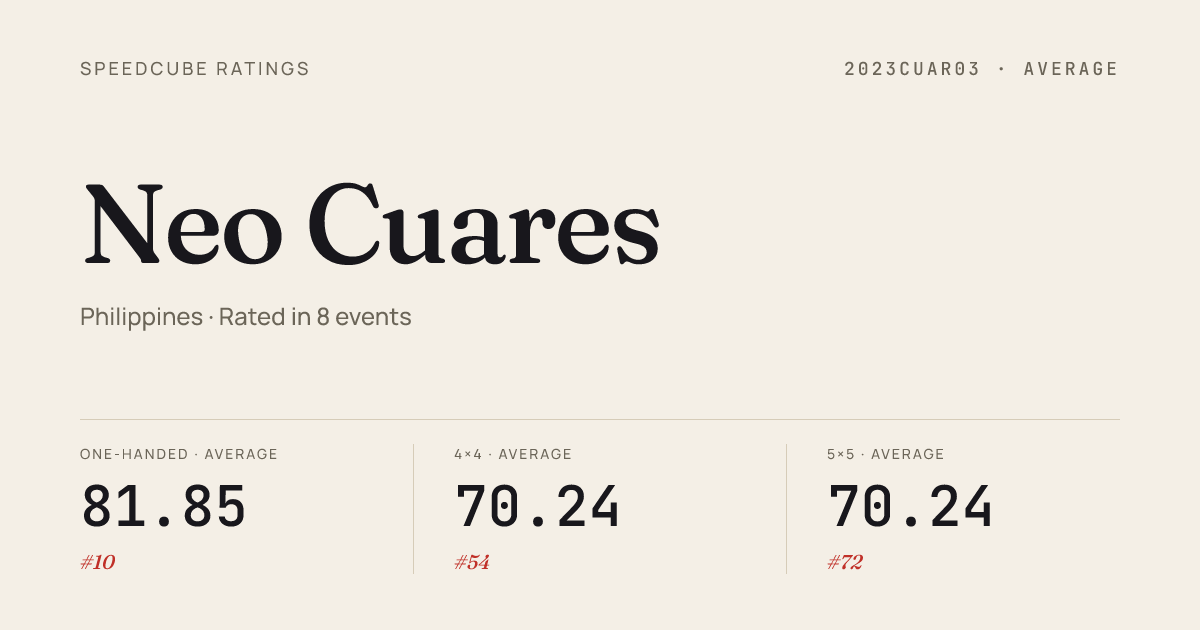 Nov 22, 20254x4x4 Cube · Round 1DublinCaliforniaOpen2025 · 2nd25.92Nov 22, 20254x4x4 Cube · FinalDublinCaliforniaOpen2025 · 2nd26.62Nov 22, 20255x5x5 Cube · Combined FinalDublinCaliforniaOpen2025 · 1st49.38Nov 14, 20252x2x2 Cube · Round 1BerkeleyNovemberWeekday2025 · 7th3.58Nov 14, 20252x2x2 Cube · FinalBerkeleyNovemberWeekday2025 · 2nd1.90Nov 14, 20253x3x3 Cube · Round 1BerkeleyNovemberWeekday2025 · 2nd6.28Nov 14, 20253x3x3 Cube · FinalBerkeleyNovemberWeekday2025 · 1st5.85Nov 14, 20253x3x3 One-Handed · Round 1BerkeleyNovemberWeekday2025 · 1st9.61Nov 14, 20253x3x3 One-Handed · FinalBerkeleyNovemberWeekday2025 · 1st8.66Nov 2, 20252x2x2 Cube · Round 1CoolDownBerkeley2025 · 3rd1.94Nov 2, 20252x2x2 Cube · FinalCoolDownBerkeley2025 · 4th2.28Nov 2, 20253x3x3 Cube · Round 1CoolDownBerkeley2025 · 1st6.01Nov 2, 20253x3x3 Cube · FinalCoolDownBerkeley2025 · 1st6.04Nov 2, 20253x3x3 Cube · Round 2CoolDownBerkeley2025 · 2nd6.20Nov 2, 20253x3x3 Blindfolded · FinalCoolDownBerkeley2025 · 5th1:21.85Nov 2, 20253x3x3 Blindfolded · Round 1CoolDownBerkeley2025 · 4th51.59Nov 2, 20254x4x4 Cube · Round 1CoolDownBerkeley2025 · 2nd25.82Nov 2, 20254x4x4 Cube · FinalCoolDownBerkeley2025 · 1st26.61Nov 2, 2025Megaminx · FinalCoolDownBerkeley2025 · 1st36.03