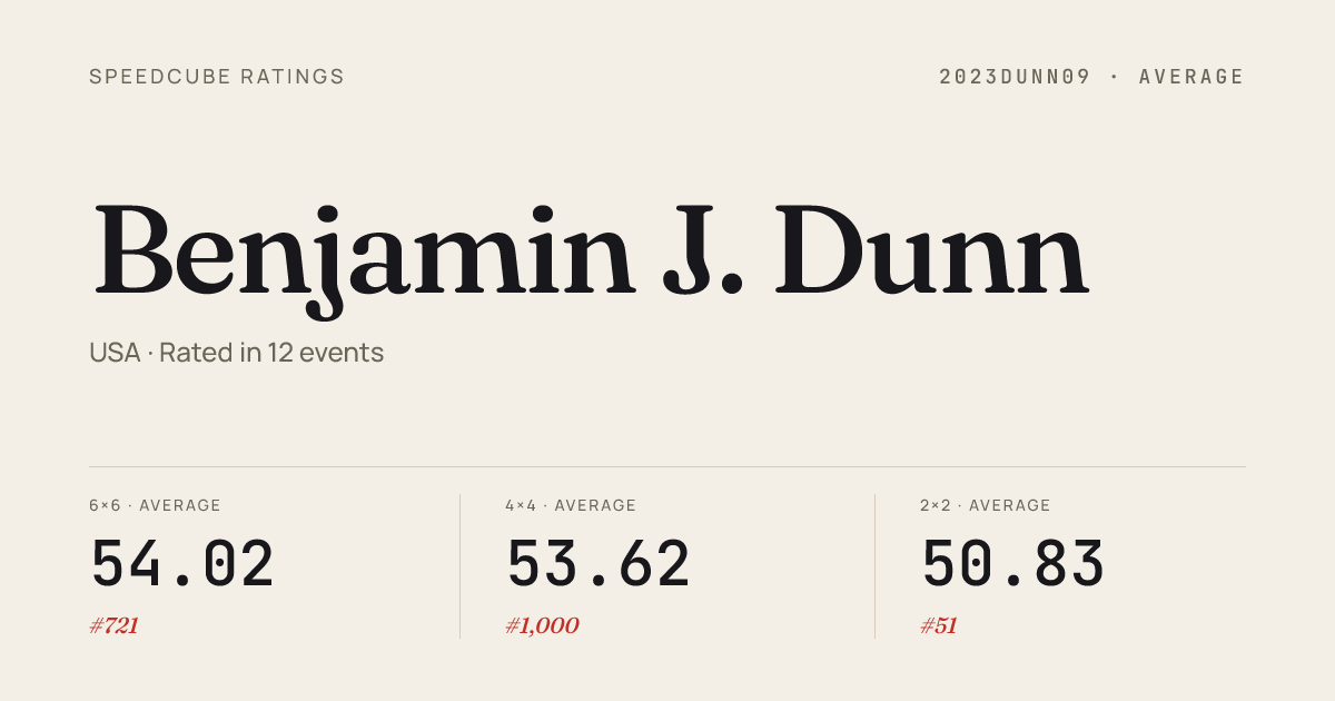 Mar 7, 20266x6x6 Cube · FinalKCKC9BigandAwkward2026 · 4th2:00.23Mar 7, 20266x6x6 Cube · Round 1KCKC9BigandAwkward2026 · 6th2:02.24Mar 7, 20267x7x7 Cube · Round 1KCKC9BigandAwkward2026 · 8th3:48.75Mar 7, 20267x7x7 Cube · FinalKCKC9BigandAwkward2026 · 4th3:04.90Mar 7, 2026Megaminx · Round 2KCKC9BigandAwkward2026 · 9th1:00.21Mar 7, 2026Megaminx · Round 1KCKC9BigandAwkward2026 · 8th1:00.91Mar 7, 2026Megaminx · FinalKCKC9BigandAwkward2026 · 7th55.65Mar 7, 2026Square-1 · FinalKCKC9BigandAwkward2026 · 5th17.19Mar 7, 2026Square-1 · Round 1KCKC9BigandAwkward2026 · 5th17.71Feb 28, 20262x2x2 Cube · Round 2WichitaArtMuseum2026 · 1st1.27Feb 28, 20262x2x2 Cube · FinalWichitaArtMuseum2026 · 1st1.52Feb 28, 20262x2x2 Cube · Round 1WichitaArtMuseum2026 · 2nd2.26Feb 28, 20263x3x3 Cube · Round 2WichitaArtMuseum2026 · 1st8.09Feb 28, 20263x3x3 Cube · Round 1WichitaArtMuseum2026 · 1st8.38Feb 28, 20263x3x3 Cube · FinalWichitaArtMuseum2026 · 1st8.19Feb 28, 20263x3x3 Blindfolded · FinalWichitaArtMuseum2026 · 5th6:07.11Feb 28, 20264x4x4 Cube · Round 1WichitaArtMuseum2026 · 1st32.65Feb 28, 20264x4x4 Cube · FinalWichitaArtMuseum2026 · 1st35.57Feb 28, 20266x6x6 Cube · Combined FinalWichitaArtMuseum2026 · 2nd1:56.34