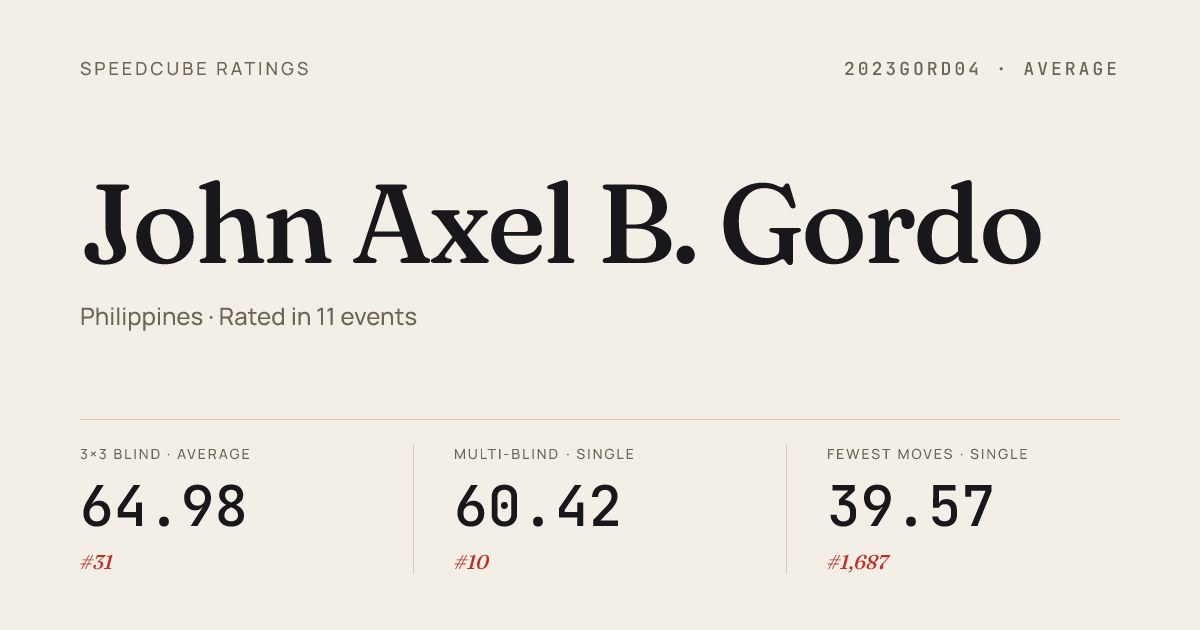 Nov 23, 2025Clock · Combined FinalRizalRaiseaSilence2025 · 19th17.06Sep 28, 20253x3x3 Cube · FinalDaretoDRRizal2025 · 8th12.72Sep 28, 20253x3x3 Fewest Moves · FinalDaretoDRRizal2025 · 8th44Sep 28, 20253x3x3 Multi-Blind · FinalDaretoDRRizal2025 · 1st46/51 in 59:12Sep 28, 20254x4x4 Blindfolded · FinalDaretoDRRizal2025 · 2nd5:15.69Sep 28, 2025Pyraminx · Combined FinalDaretoDRRizal2025 · 10th8.66Aug 3, 20253x3x3 Blindfolded · Round 1PRsinBinondo2025 · 1st22.43Aug 3, 20253x3x3 Blindfolded · FinalPRsinBinondo2025 · 1st22.39Aug 3, 20253x3x3 Multi-Blind · FinalPRsinBinondo2025 · 1st39/56 in 58:55Aug 3, 20254x4x4 Blindfolded · FinalPRsinBinondo2025 · 2nd4:08.01Jul 27, 20253x3x3 Blindfolded · Round 1Kadiliman2025 · 2nd24.16Jul 27, 20253x3x3 Blindfolded · FinalKadiliman2025 · 2nd20.13Jul 27, 20254x4x4 Blindfolded · FinalKadiliman2025 · 4th4:53.80Jun 22, 20252x2x2 Cube · Round 1PhilippineChampionship2025 · national · 93rd5.96Jun 22, 20253x3x3 Cube · Round 1PhilippineChampionship2025 · national · 29th9.33Jun 22, 20253x3x3 Cube · Round 2PhilippineChampionship2025 · national · 28th9.27Jun 22, 20253x3x3 Cube · Semi-FinalPhilippineChampionship2025 · national · 28th9.85Jun 22, 20253x3x3 Blindfolded · FinalPhilippineChampionship2025 · national · 4th22.97Jun 22, 20253x3x3 Blindfolded · Round 1PhilippineChampionship2025 · national · 4th25.19Jun 22, 20253x3x3 Multi-Blind · FinalPhilippineChampionship2025 · national · 1st42/46 in 57:51