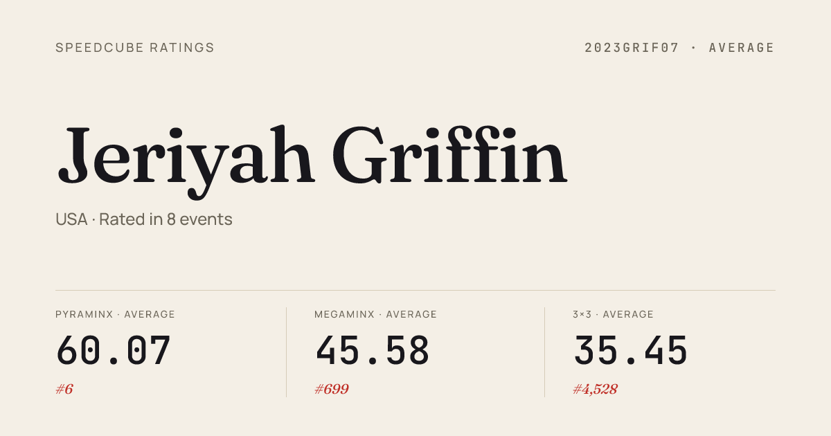 Mar 22, 2026Clock · Round 1OhioStateMadness2026 · 22nd10.71Mar 22, 2026Megaminx · Round 1OhioStateMadness2026 · 8th54.97Mar 22, 2026Pyraminx · Round 2OhioStateMadness2026 · 1st1.38Mar 22, 2026Pyraminx · Round 1OhioStateMadness2026 · 1st1.68Mar 22, 2026Pyraminx · FinalOhioStateMadness2026 · 1st2.19Dec 21, 20252x2x2 Cube · Round 2OhioChampionship2025 · 20th3.12Dec 21, 20252x2x2 Cube · Round 1OhioChampionship2025 · 12th2.54Dec 21, 20253x3x3 Cube · Round 2OhioChampionship2025 · 27th9.93Dec 21, 20253x3x3 Cube · Round 1OhioChampionship2025 · 60th12.23Dec 21, 20253x3x3 Cube · Semi-FinalOhioChampionship2025 · 39th10.78Dec 21, 20253x3x3 One-Handed · Round 1OhioChampionship2025 · 54th25.50Dec 21, 20253x3x3 One-Handed · Round 2OhioChampionship2025 · 31st19.85Dec 21, 20254x4x4 Cube · Round 1OhioChampionship2025 · 79th1:02.62Dec 21, 2025Clock · Round 1OhioChampionship2025 · 65th16.25Dec 21, 2025Megaminx · FinalOhioChampionship2025 · 12th54.32Dec 21, 2025Megaminx · Round 1OhioChampionship2025 · 11th52.13Dec 21, 2025Pyraminx · Round 1OhioChampionship2025 · 4th2.22Dec 21, 2025Pyraminx · FinalOhioChampionship2025 · 1st1.82Dec 21, 2025Pyraminx · Round 2OhioChampionship2025 · 1st1.65