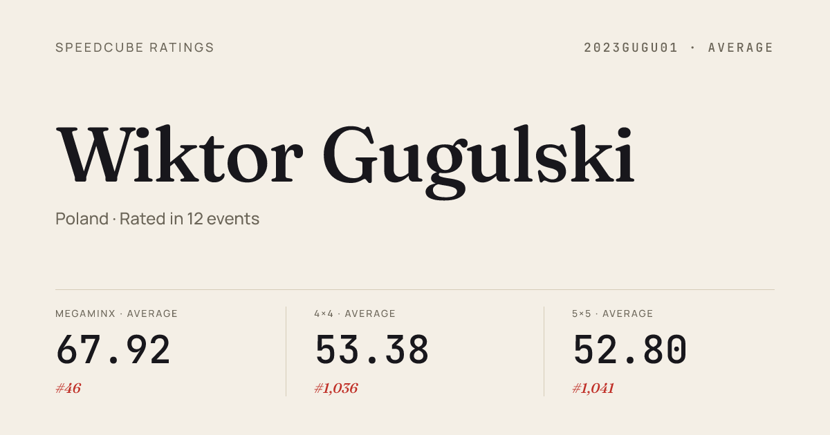 - Apr 19, 2026Megaminx · FinalCubeFactoryLeagueJezow2026 · 1st33.45