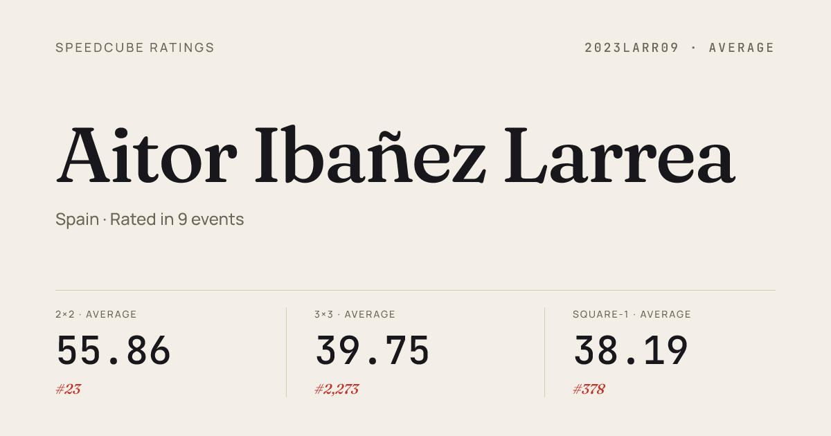 Apr 12, 20263x3x3 Cube · Round 2JesuitinasTxantreaOpen2026 · 5th9.83Apr 12, 20263x3x3 Cube · Round 1JesuitinasTxantreaOpen2026 · 4th9.21Apr 12, 20263x3x3 One-Handed · Combined FinalJesuitinasTxantreaOpen2026 · 7th24.48Apr 12, 20264x4x4 Cube · Round 2JesuitinasTxantreaOpen2026 · 10th53.14Apr 12, 20264x4x4 Cube · Round 1JesuitinasTxantreaOpen2026 · 10th53.42Apr 12, 2026Megaminx · Round 1JesuitinasTxantreaOpen2026 · 6th1:15.81Apr 12, 2026Megaminx · FinalJesuitinasTxantreaOpen2026 · 6th1:13.95Apr 12, 2026Pyraminx · Round 1JesuitinasTxantreaOpen2026 · 1st3.36Apr 12, 2026Pyraminx · FinalJesuitinasTxantreaOpen2026 · 1st2.98Apr 12, 2026Skewb · Round 1JesuitinasTxantreaOpen2026 · 4th5.62Apr 12, 2026Skewb · FinalJesuitinasTxantreaOpen2026 · 3rd4.37Apr 12, 2026Square-1 · Round 1JesuitinasTxantreaOpen2026 · 2nd11.11Apr 12, 2026Square-1 · FinalJesuitinasTxantreaOpen2026 · 2nd11.91Mar 29, 20262x2x2 Cube · FinalUrnietaOpen2026 · 1st1.17Mar 29, 20262x2x2 Cube · Round 1UrnietaOpen2026 · 1st1.63Mar 29, 20262x2x2 Cube · Round 2UrnietaOpen2026 · 1st1.38Mar 29, 20263x3x3 Cube · FinalUrnietaOpen2026 · 2nd8.09Mar 29, 20263x3x3 Cube · Round 1UrnietaOpen2026 · 6th9.42Mar 29, 20263x3x3 Cube · Round 2UrnietaOpen2026 · 7th10.18Mar 29, 20263x3x3 One-Handed · Combined FinalUrnietaOpen2026 · 8th22.23