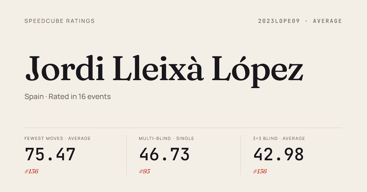 Mar 15, 20263x3x3 Multi-Blind · FinalParetsOpen2026 · 2nd20/23 in 58:42Mar 15, 20263x3x3 One-Handed · Combined FinalParetsOpen2026 · 16th20.68Mar 15, 20264x4x4 Blindfolded · FinalParetsOpen2026 · 1st2:08.30Mar 15, 20265x5x5 Blindfolded · FinalParetsOpen2026 · 1st8:06.19Mar 15, 20266x6x6 Cube · FinalParetsOpen2026 · 23rd3:30.28Mar 15, 2026Pyraminx · Round 1ParetsOpen2026 · 18th6.13Mar 15, 2026Pyraminx · Round 2ParetsOpen2026 · 20th7.18Mar 15, 2026Skewb · Combined FinalParetsOpen2026 · 8th5.46Mar 15, 2026Skewb · Round 1ParetsOpen2026 · 4th4.20Mar 15, 2026Square-1 · Combined FinalParetsOpen2026 · 14th21.84Feb 28, 20262x2x2 Cube · Round 1VilafrancaOpen2026 · 17th5.20Feb 28, 20262x2x2 Cube · FinalVilafrancaOpen2026 · 7th3.96Feb 28, 20263x3x3 Cube · Round 1VilafrancaOpen2026 · 26th16.37Feb 28, 20263x3x3 One-Handed · Combined FinalVilafrancaOpen2026 · 9th23.42Feb 28, 20264x4x4 Cube · Round 1VilafrancaOpen2026 · 21st1:03.48Feb 28, 20265x5x5 Cube · Round 1VilafrancaOpen2026 · 17th1:57.62Jan 31, 20263x3x3 Fewest Moves · Round 1EuropeFMCFriendsWinter2026 · 67th22Jan 31, 20263x3x3 Fewest Moves · FinalEuropeFMCFriendsWinter2026 · 25th28.00Dec 21, 20253x3x3 Fewest Moves · FinalFMCundertheMistletoe2025 · 24th24.67