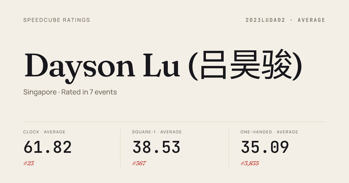 - Mar 22, 2026Pyraminx · Round 1SingaporePyraminxMarch2026 · 9th3.80