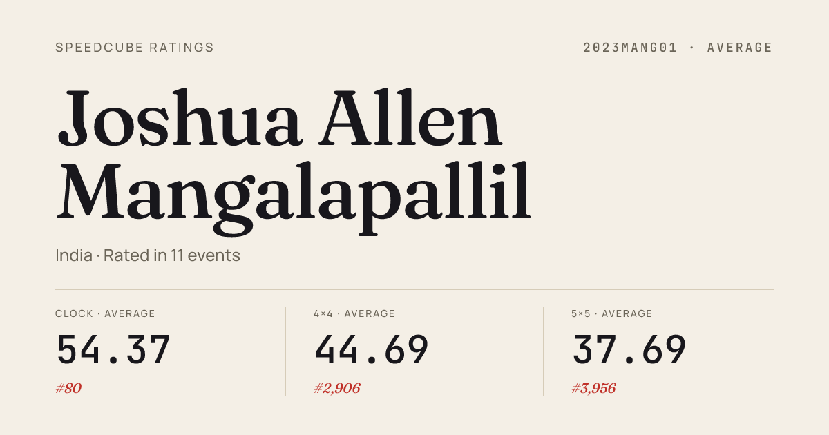 Mar 29, 2026Clock · Combined FinalIISERPunePARAMOpen2026 · 1st3.29Mar 29, 2026Pyraminx · Round 1IISERPunePARAMOpen2026 · 7th5.60Mar 29, 2026Pyraminx · Combined FinalIISERPunePARAMOpen2026 · 7th5.29Dec 6, 20253x3x3 Fewest Moves · FinalFMCPune2025 · 8th32Dec 6, 2025Clock · FinalFMCPune2025 · 5th5.95Dec 6, 2025Clock · Round 1FMCPune2025 · 2nd6.27Oct 12, 20252x2x2 Cube · FinalMumbaiCubingSprint2025 · 7th4.05Oct 12, 20252x2x2 Cube · Round 1MumbaiCubingSprint2025 · 2nd2.77Oct 12, 20252x2x2 Cube · Round 2MumbaiCubingSprint2025 · 5th3.39Oct 12, 20253x3x3 Cube · Round 1MumbaiCubingSprint2025 · 9th10.65Oct 12, 20253x3x3 Cube · Round 2MumbaiCubingSprint2025 · 16th12.62Oct 12, 20253x3x3 One-Handed · Round 1MumbaiCubingSprint2025 · 12th21.12Oct 12, 20253x3x3 One-Handed · FinalMumbaiCubingSprint2025 · 8th20.76Oct 12, 20254x4x4 Cube · FinalMumbaiCubingSprint2025 · 5th42.09Oct 12, 20254x4x4 Cube · Round 1MumbaiCubingSprint2025 · 4th40.81Oct 12, 20255x5x5 Cube · Combined FinalMumbaiCubingSprint2025 · 5th1:26.30Oct 12, 2025Clock · FinalMumbaiCubingSprint2025 · 1st4.68Oct 12, 2025Clock · Round 1MumbaiCubingSprint2025 · 3rd5.92Oct 12, 2025Megaminx · Combined FinalMumbaiCubingSprint2025 · 5th1:23.40