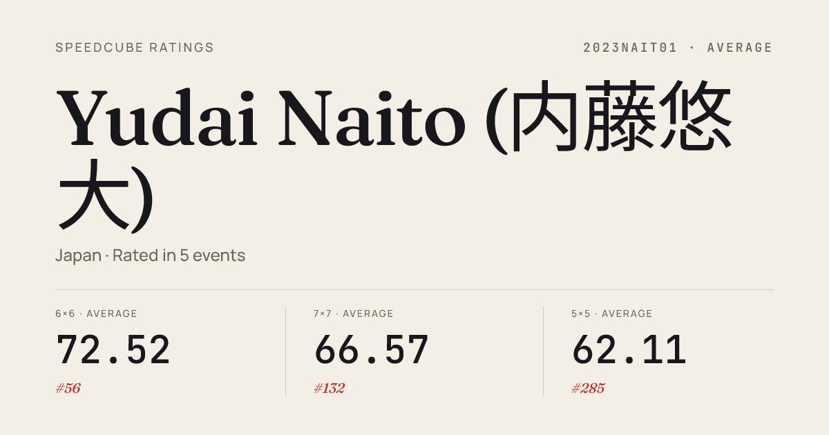 Dec 14, 20257x7x7 Cube · Round 1TokaiBigCubes2025 · 6th2:27.27Dec 14, 20257x7x7 Cube · FinalTokaiBigCubes2025 · 4th2:29.66Sep 23, 20256x6x6 Cube · Round 1TokyoAutumn2025 · 6th1:42.20Sep 23, 20256x6x6 Cube · FinalTokyoAutumn2025 · 4th1:30.54Sep 23, 20257x7x7 Cube · Round 1TokyoAutumn2025 · 5th2:24.47Sep 23, 20257x7x7 Cube · FinalTokyoAutumn2025 · 4th2:14.95Mar 20, 20256x6x6 Cube · Round 1OtaSpring2025 · 3rd1:42.00Mar 20, 20256x6x6 Cube · FinalOtaSpring2025 · 4th1:48.94Mar 20, 2025Megaminx · Round 1OtaSpring2025 · 15th58.40May 25, 20243x3x3 Cube · Round 1Kanazawa2024 · 7th9.08May 25, 20243x3x3 Cube · Round 2Kanazawa2024 · 7th8.75May 25, 20243x3x3 Cube · Combined FinalKanazawa2024 · 6th8.01May 25, 20244x4x4 Cube · Combined FinalKanazawa2024 · 7th31.88May 25, 20244x4x4 Cube · Round 1Kanazawa2024 · 8th33.27Jul 17, 20233x3x3 Cube · Round 1AyaseSummer2023 · 7th8.64Jul 17, 20233x3x3 Cube · Combined FinalAyaseSummer2023 · 4th8.25Jul 17, 2023Megaminx · Round 1AyaseSummer2023 · 15th1:07.57May 27, 20233x3x3 Cube · Combined FinalKanazawaChallengeSpringPM2023 · 3rd9.18May 27, 20234x4x4 Cube · Combined FinalKanazawaChallengeSpringPM2023 · 7th36.34