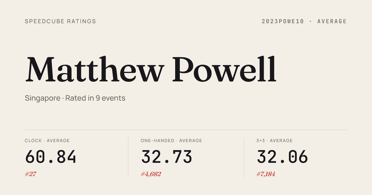 Mar 8, 2026Pyraminx · FinalBacktoDowntownSingapore2026 · 8th3.95Mar 8, 2026Pyraminx · Round 1BacktoDowntownSingapore2026 · 6th3.28Mar 8, 2026Square-1 · Round 1BacktoDowntownSingapore2026 · 9th33.03Feb 22, 20262x2x2 Cube · Round 1SingaporeChampionship2026 · national · 30th3.50Feb 22, 20262x2x2 Cube · Round 2SingaporeChampionship2026 · national · 35th4.21Feb 22, 20263x3x3 Cube · Round 1SingaporeChampionship2026 · national · 86th11.76Feb 22, 2026Clock · Round 1SingaporeChampionship2026 · national · 8th3.91Feb 22, 2026Clock · Round 2SingaporeChampionship2026 · national · 2nd3.11Feb 22, 2026Clock · FinalSingaporeChampionship2026 · national · 4th3.20Feb 22, 2026Pyraminx · Round 1SingaporeChampionship2026 · national · 23rd4.61Feb 22, 2026Pyraminx · Round 2SingaporeChampionship2026 · national · 13th3.27Feb 22, 2026Skewb · Round 2SingaporeChampionship2026 · national · 18th5.12Feb 22, 2026Skewb · Round 1SingaporeChampionship2026 · national · 7th4.31Jan 4, 20262x2x2 Cube · Round 1SingaporeWarmUpJanuary2026 · 35th6.28Jan 4, 20263x3x3 Cube · Round 1SingaporeWarmUpJanuary2026 · 38th13.61Jan 4, 20263x3x3 One-Handed · Round 1SingaporeWarmUpJanuary2026 · 20th22.16Jan 4, 20264x4x4 Cube · Round 1SingaporeWarmUpJanuary2026 · 29th53.29Jan 4, 2026Clock · FinalSingaporeWarmUpJanuary2026 · 3rd3.66Jan 4, 2026Clock · Round 1SingaporeWarmUpJanuary2026 · 5th4.08Jan 4, 2026Pyraminx · Round 1SingaporeWarmUpJanuary2026 · 13th3.41