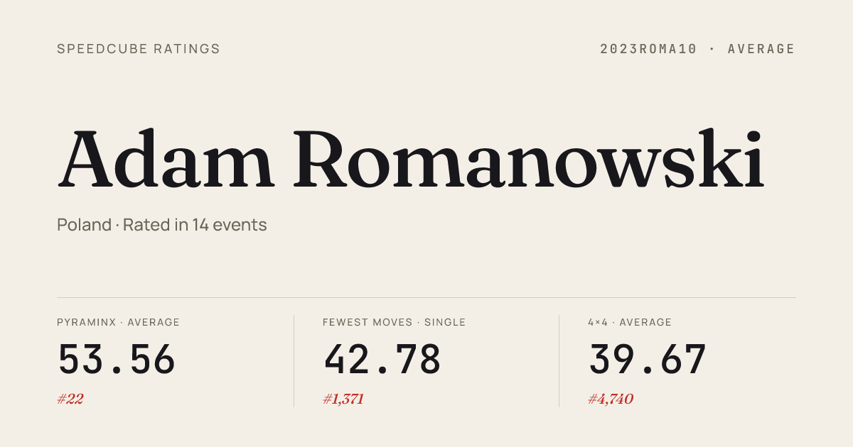 Apr 19, 20263x3x3 Cube · Round 1CubeFactoryLeagueJezow2026 · 18th10.41Apr 19, 20263x3x3 Cube · FinalCubeFactoryLeagueJezow2026 · 29th12.31Apr 19, 20264x4x4 Cube · Round 1CubeFactoryLeagueJezow2026 · 36th52.02Apr 19, 2026Clock · Round 1CubeFactoryLeagueJezow2026 · 32nd10.61Apr 19, 2026Megaminx · Round 1CubeFactoryLeagueJezow2026 · 23rd1:12.82Apr 19, 2026Pyraminx · Round 1CubeFactoryLeagueJezow2026 · 2nd1.97Apr 19, 2026Pyraminx · FinalCubeFactoryLeagueJezow2026 · 2nd1.96Apr 19, 2026Skewb · FinalCubeFactoryLeagueJezow2026 · 8th4.75Apr 19, 2026Skewb · Round 1CubeFactoryLeagueJezow2026 · 5th3.78Apr 19, 2026Square-1 · FinalCubeFactoryLeagueJezow2026 · 9th14.76Apr 19, 2026Square-1 · Round 1CubeFactoryLeagueJezow2026 · 9th16.55Mar 15, 20262x2x2 Cube · Round 1CubeFactoryLeagueRogow2026 · 8th2.28Mar 15, 20262x2x2 Cube · FinalCubeFactoryLeagueRogow2026 · 7th1.79Mar 15, 20263x3x3 Cube · Round 1CubeFactoryLeagueRogow2026 · 29th11.03Mar 15, 20263x3x3 Cube · Round 2CubeFactoryLeagueRogow2026 · 24th10.58Mar 15, 20263x3x3 One-Handed · Round 1CubeFactoryLeagueRogow2026 · 16th19.81Mar 15, 20264x4x4 Cube · Round 1CubeFactoryLeagueRogow2026 · 30th44.59Mar 15, 2026Clock · Round 1CubeFactoryLeagueRogow2026 · 26th8.11Mar 15, 2026Megaminx · Round 1CubeFactoryLeagueRogow2026 · 35th1:20.99Mar 15, 2026Pyraminx · Round 1CubeFactoryLeagueRogow2026 · 5th2.93
