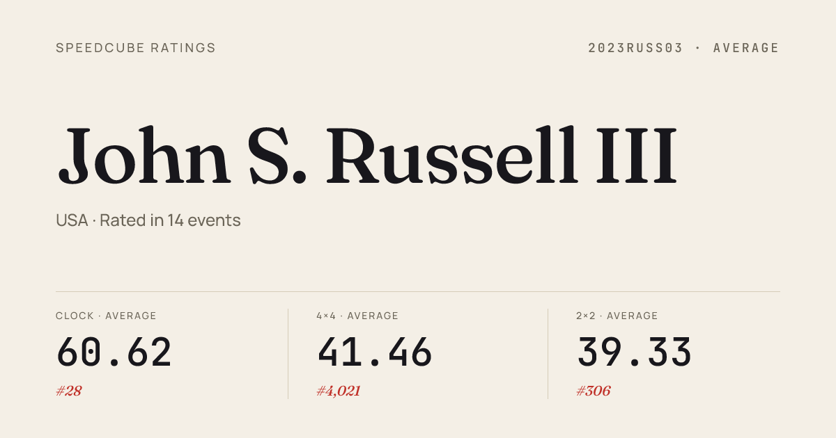 Apr 4, 20264x4x4 Cube · Round 1CubeAgainstCancerLA2026 · 7th42.49Apr 4, 20264x4x4 Cube · FinalCubeAgainstCancerLA2026 · 11th45.10Apr 4, 20265x5x5 Cube · Combined FinalCubeAgainstCancerLA2026 · 11th1:41.48Apr 4, 2026Clock · FinalCubeAgainstCancerLA2026 · 1st3.52Apr 4, 2026Pyraminx · FinalCubeAgainstCancerLA2026 · 7th4.52Apr 4, 2026Pyraminx · Round 1CubeAgainstCancerLA2026 · 7th4.59Apr 4, 2026Skewb · FinalCubeAgainstCancerLA2026 · 5th6.14Jan 3, 20262x2x2 Cube · FinalBatonRougeWinter2026 · 4th2.53Jan 3, 20262x2x2 Cube · Round 1BatonRougeWinter2026 · 1st2.29Jan 3, 20263x3x3 Cube · FinalBatonRougeWinter2026 · 8th9.96Jan 3, 20263x3x3 Cube · Round 2BatonRougeWinter2026 · 12th10.77Jan 3, 20263x3x3 Cube · Round 1BatonRougeWinter2026 · 10th10.15Jan 3, 20264x4x4 Cube · FinalBatonRougeWinter2026 · 7th44.34Jan 3, 20264x4x4 Cube · Round 1BatonRougeWinter2026 · 12th49.76Jan 3, 2026Pyraminx · Round 1BatonRougeWinter2026 · 9th6.25Jan 3, 2026Pyraminx · FinalBatonRougeWinter2026 · 9th7.09Aug 24, 20252x2x2 Cube · FinalLouisianaMegaTwoDay2025 · 7th2.87Aug 24, 20252x2x2 Cube · Round 1LouisianaMegaTwoDay2025 · 6th2.75Aug 24, 20253x3x3 Cube · Round 2LouisianaMegaTwoDay2025 · 11th10.66