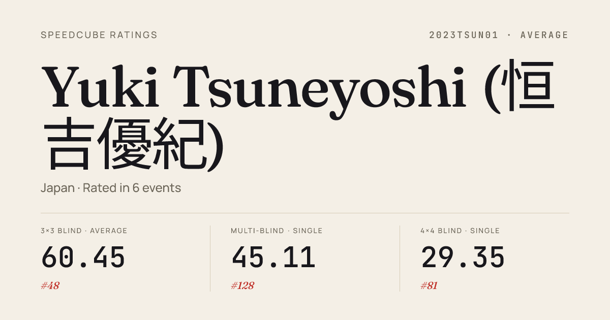 - Mar 29, 20263x3x3 Blindfolded · Round 2TokyoBLDSpring2026 · 4th23.72