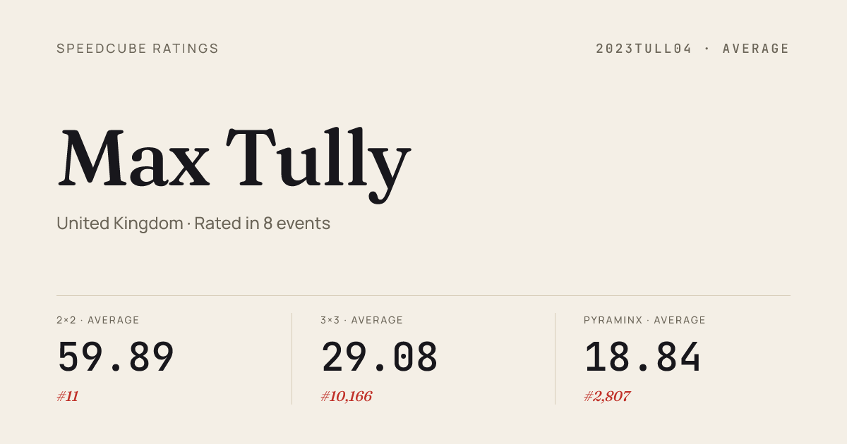 Apr 5, 20263x3x3 Cube · Round 1KirkkonummenKuutionvaantelyt2026 · 20th13.85Apr 5, 20263x3x3 Cube · FinalKirkkonummenKuutionvaantelyt2026 · 15th13.79Apr 5, 2026Pyraminx · Round 2KirkkonummenKuutionvaantelyt2026 · 13th5.75Apr 5, 2026Pyraminx · Round 1KirkkonummenKuutionvaantelyt2026 · 18th7.36Apr 5, 2026Pyraminx · FinalKirkkonummenKuutionvaantelyt2026 · 13th5.50Apr 5, 2026Skewb · Round 2KirkkonummenKuutionvaantelyt2026 · 22nd10.24Apr 5, 2026Skewb · Round 1KirkkonummenKuutionvaantelyt2026 · 24th11.91Mar 15, 20262x2x2 Cube · FinalStevenageMarch2026 · 1st1.48Mar 15, 20262x2x2 Cube · Round 2StevenageMarch2026 · 4th1.63Mar 15, 20262x2x2 Cube · Round 1StevenageMarch2026 · 2nd1.46Mar 15, 20263x3x3 Cube · Round 2StevenageMarch2026 · 53rd11.97Mar 15, 20263x3x3 Cube · Round 1StevenageMarch2026 · 64th14.39Mar 15, 2026Pyraminx · Round 1StevenageMarch2026 · 46th8.24Jan 11, 20262x2x2 Cube · Round 1StevenageJanuary2026 · 2nd1.59Jan 11, 20262x2x2 Cube · FinalStevenageJanuary2026 · 1st1.43Jan 11, 20263x3x3 Cube · Round 2StevenageJanuary2026 · 53rd13.35Jan 11, 20263x3x3 Cube · FinalStevenageJanuary2026 · 53rd13.28Jan 11, 20263x3x3 Cube · Round 1StevenageJanuary2026 · 24th10.31Jan 11, 2026Skewb · FinalStevenageJanuary2026 · 72nd15.26Jan 11, 2026Skewb · Round 1StevenageJanuary2026 · 53rd9.34