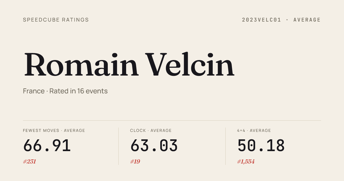 Apr 19, 20263x3x3 Blindfolded · FinalLeSpeedcubeDeMorteau2026 · 3rd57.48Apr 19, 20264x4x4 Cube · Combined FinalLeSpeedcubeDeMorteau2026 · 2nd36.41Apr 19, 2026Skewb · FinalLeSpeedcubeDeMorteau2026 · 2nd4.82Apr 6, 20262x2x2 Cube · Round 1FrenchChampionship2026 · national · 34th2.81Apr 6, 20262x2x2 Cube · Round 2FrenchChampionship2026 · national · 59th3.85Apr 6, 20263x3x3 Cube · Round 1FrenchChampionship2026 · national · 76th10.06Apr 6, 20263x3x3 Cube · Round 2FrenchChampionship2026 · national · 55th9.52Apr 6, 20263x3x3 Blindfolded · Round 1FrenchChampionship2026 · national · 21st43.50Apr 6, 20263x3x3 Fewest Moves · FinalFrenchChampionship2026 · national · 12th27.33Apr 6, 20263x3x3 Multi-Blind · FinalFrenchChampionship2026 · national · 7th19/21 in 55:48Apr 6, 20263x3x3 One-Handed · Round 1FrenchChampionship2026 · national · 45th17.61Apr 6, 20263x3x3 One-Handed · Round 2FrenchChampionship2026 · national · 35th17.34Apr 6, 20264x4x4 Cube · Round 2FrenchChampionship2026 · national · 36th35.47Apr 6, 20264x4x4 Cube · Round 1FrenchChampionship2026 · national · 56th38.50Apr 6, 20264x4x4 Blindfolded · FinalFrenchChampionship2026 · national · 8th5:35.44Apr 6, 20265x5x5 Cube · Round 1FrenchChampionship2026 · national · 42nd1:07.30Apr 6, 20265x5x5 Blindfolded · FinalFrenchChampionship2026 · national · 9th15:34.00Apr 6, 20267x7x7 Cube · FinalFrenchChampionship2026 · national · 30th3:28.84Apr 6, 2026Clock · FinalFrenchChampionship2026 · national · 1st3.23