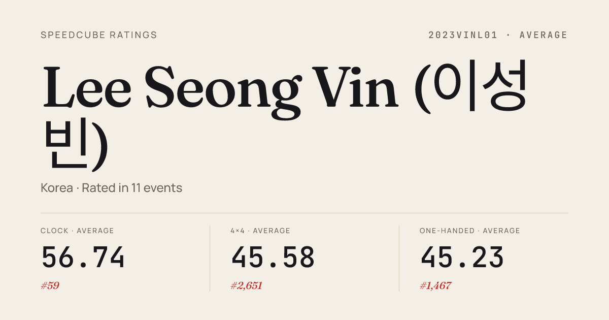 - Feb 22, 20263x3x3 Cube · Round 1CubeCampinJeju2026 · 25th10.69