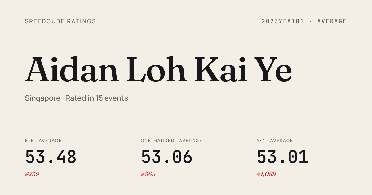 Apr 11, 20266x6x6 Cube · Round 1NUSMasters2026 · 9th1:58.10Apr 11, 20267x7x7 Cube · Round 1NUSMasters2026 · 12th3:23.56Apr 11, 2026Megaminx · FinalNUSMasters2026 · 6th48.99Apr 11, 2026Megaminx · Round 1NUSMasters2026 · 5th46.93Apr 11, 2026Pyraminx · Round 1NUSMasters2026 · 9th3.59Apr 11, 2026Square-1 · FinalNUSMasters2026 · 3rd9.61Apr 11, 2026Square-1 · Round 1NUSMasters2026 · 1st8.22Mar 22, 20263x3x3 Cube · Round 1SingaporePyraminxMarch2026 · 18th10.50Mar 22, 20263x3x3 One-Handed · Round 1SingaporePyraminxMarch2026 · 6th15.66Mar 22, 20263x3x3 One-Handed · FinalSingaporePyraminxMarch2026 · 2nd13.61Mar 22, 20263x3x3 One-Handed · Round 2SingaporePyraminxMarch2026 · 3rd13.12Mar 22, 20264x4x4 Cube · Round 2SingaporePyraminxMarch2026 · 8th33.93Mar 22, 20264x4x4 Cube · Round 1SingaporePyraminxMarch2026 · 8th34.44Mar 22, 20264x4x4 Cube · FinalSingaporePyraminxMarch2026 · 7th32.90Mar 22, 20266x6x6 Cube · Round 1SingaporePyraminxMarch2026 · 9th1:56.11Mar 22, 2026Clock · FinalSingaporePyraminxMarch2026 · 6th4.72Mar 22, 2026Clock · Round 1SingaporePyraminxMarch2026 · 7th5.77Mar 22, 2026Pyraminx · Round 1SingaporePyraminxMarch2026 · 8th3.67Mar 22, 2026Pyraminx · Round 2SingaporePyraminxMarch2026 · 7th3.30