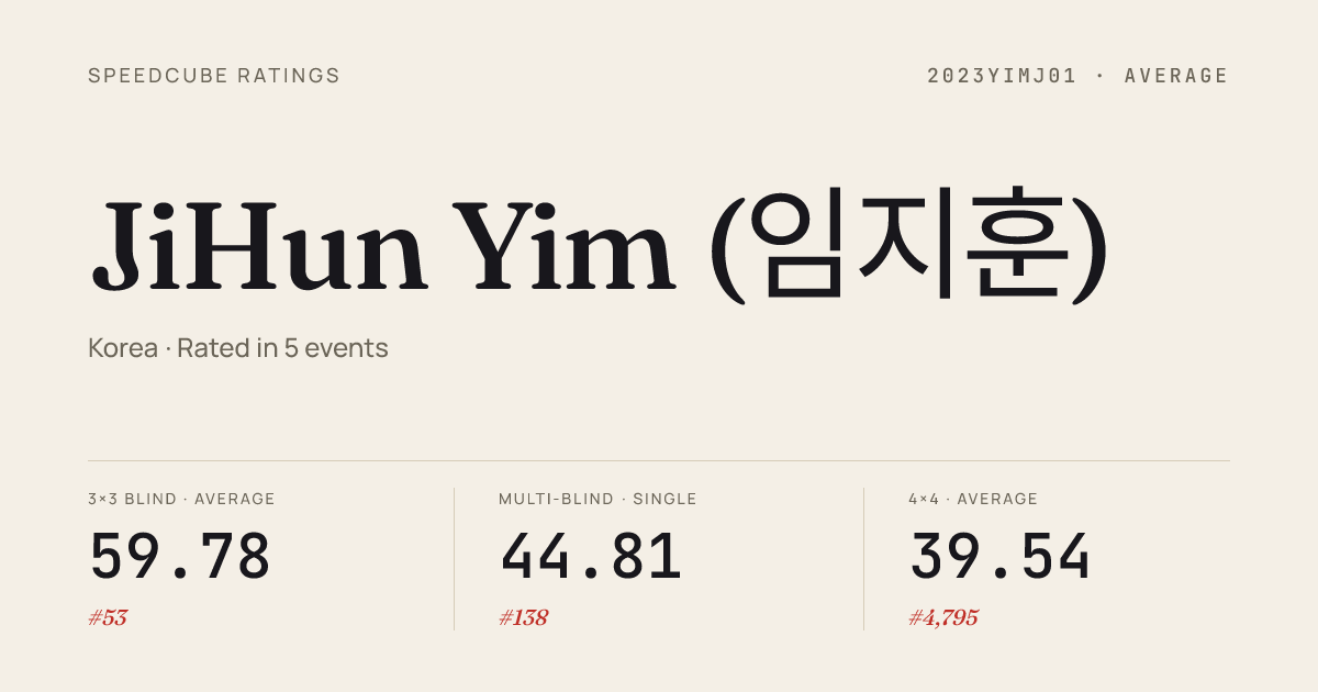 Feb 6, 20263x3x3 Blindfolded · Round 1BerkeleyFebruaryWeekday2026 · 3rd22.91Feb 6, 20263x3x3 Blindfolded · FinalBerkeleyFebruaryWeekday2026 · 3rd22.67Jan 18, 20263x3x3 Cube · Round 2SeoulWinter2026 · 54th11.18Jan 18, 20263x3x3 Cube · Round 1SeoulWinter2026 · 47th11.13Jan 18, 20263x3x3 Cube · Semi-FinalSeoulWinter2026 · 55th11.63Jan 18, 20263x3x3 Blindfolded · Round 1SeoulWinter2026 · 2nd23.61Jan 18, 20263x3x3 Blindfolded · FinalSeoulWinter2026 · 1st22.47Jan 18, 20264x4x4 Cube · Round 1SeoulWinter2026 · 51st48.58Jan 18, 20265x5x5 Cube · Round 1SeoulWinter2026 · 57th1:36.69Dec 28, 20253x3x3 Blindfolded · FinalKoreanChampionship2025 · national · 3rd24.70Dec 28, 20253x3x3 Blindfolded · Round 1KoreanChampionship2025 · national · 1st24.61Dec 28, 20253x3x3 Multi-Blind · FinalKoreanChampionship2025 · national · 7th17/20 in 55:03Nov 15, 20253x3x3 Cube · Round 1UhseoOsong2025 · 36th10.91Nov 15, 20253x3x3 Blindfolded · FinalUhseoOsong2025 · 2nd21.36Nov 15, 20253x3x3 Blindfolded · Round 1UhseoOsong2025 · 3rd21.85Nov 15, 20253x3x3 One-Handed · Round 1UhseoOsong2025 · 36th23.56Nov 15, 20254x4x4 Cube · Round 1UhseoOsong2025 · 38th48.30Oct 19, 20252x2x2 Cube · Round 1OkcheonAutumnBreeze2025 · 36th6.34Oct 19, 20253x3x3 Cube · Round 1OkcheonAutumnBreeze2025 · 28th11.35
