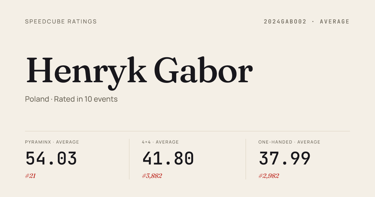 Apr 12, 20263x3x3 Cube · Round 2MielecCubingDays2026 · 19th10.63Apr 12, 20263x3x3 One-Handed · Round 1MielecCubingDays2026 · 21st21.53Apr 12, 20263x3x3 One-Handed · Round 2MielecCubingDays2026 · 18th19.51Apr 12, 20264x4x4 Cube · Round 1MielecCubingDays2026 · 22nd44.45Apr 12, 20265x5x5 Cube · Round 1MielecCubingDays2026 · 30th1:55.46Apr 12, 2026Clock · Round 1MielecCubingDays2026 · 10th6.87Apr 12, 2026Clock · FinalMielecCubingDays2026 · 7th5.61Apr 12, 2026Megaminx · Round 1MielecCubingDays2026 · 23rd1:17.54Apr 12, 2026Megaminx · Round 2MielecCubingDays2026 · 17th1:06.39Apr 12, 2026Pyraminx · Round 1MielecCubingDays2026 · 1st1.90Apr 12, 2026Pyraminx · FinalMielecCubingDays2026 · 1st1.83Apr 12, 2026Skewb · Round 2MielecCubingDays2026 · 16th5.10Apr 12, 2026Skewb · Round 1MielecCubingDays2026 · 19th5.92Apr 12, 2026Square-1 · Combined FinalMielecCubingDays2026 · 8th13.59Mar 29, 20262x2x2 Cube · Round 2GorzowCubingDays2026 · 16th3.62Mar 29, 20262x2x2 Cube · Round 1GorzowCubingDays2026 · 15th3.79Mar 29, 20263x3x3 Cube · FinalGorzowCubingDays2026 · 18th10.62Mar 29, 20263x3x3 Cube · Round 1GorzowCubingDays2026 · 24th11.91Mar 29, 20263x3x3 Cube · Round 2GorzowCubingDays2026 · 13th10.15