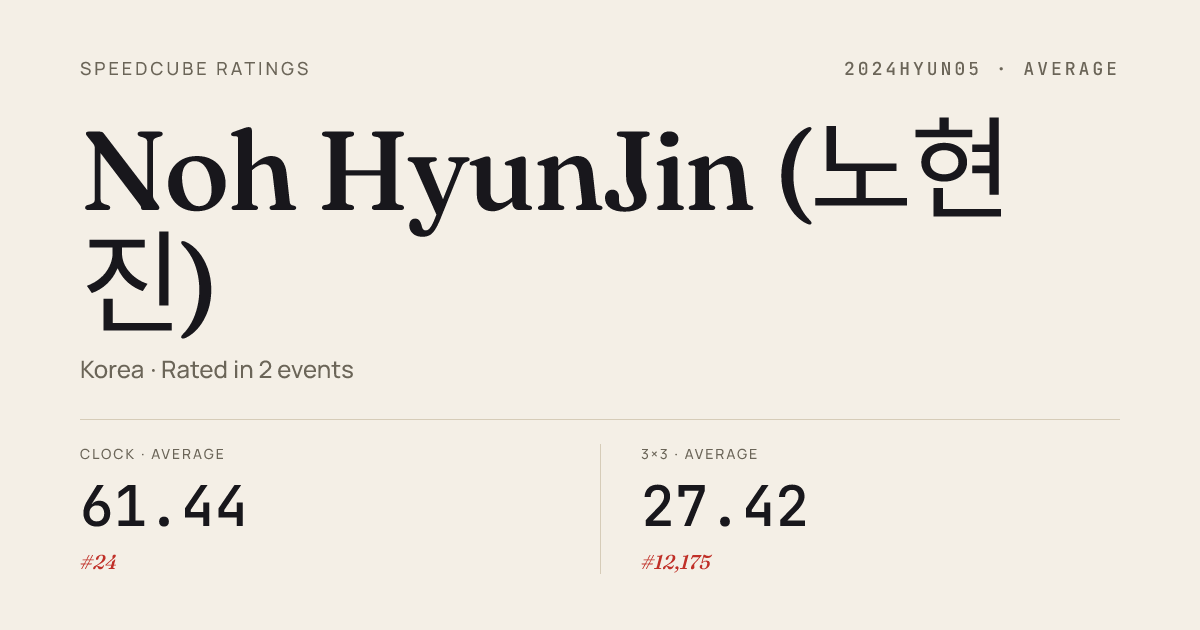 Dec 28, 2025Clock · Round 1KoreanChampionship2025 · national · 1st3.66Oct 19, 2025Clock · Round 1OkcheonAutumnBreeze2025 · 1st3.46Oct 19, 2025Clock · FinalOkcheonAutumnBreeze2025 · 4th4.45Aug 17, 2025Clock · FinalKoreaOpen2025 · 5th5.10Aug 17, 2025Clock · Round 2KoreaOpen2025 · 10th5.95Aug 17, 2025Clock · Round 1KoreaOpen2025 · 5th5.61Feb 9, 2025Clock · FinalAnyangHaseyo2025 · 2nd5.07Feb 9, 2025Clock · Round 1AnyangHaseyo2025 · 8th6.64Aug 17, 2024Clock · FinalKoreanChampionship2024 · national · 7th7.72Aug 17, 2024Clock · Round 1KoreanChampionship2024 · national · 8th7.83Jun 22, 20243x3x3 Cube · FinalKoreaQualifierSeoulA2024 · 41st45.48