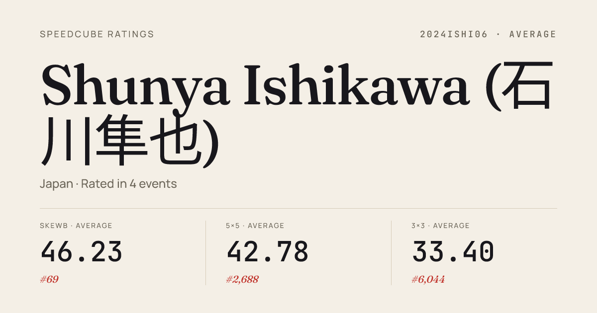 Mar 22, 20263x3x3 Cube · Round 1KatanoSpring2026 · 40th11.63Mar 22, 20263x3x3 One-Handed · Round 1KatanoSpring2026 · 30th19.79Mar 22, 20264x4x4 Cube · Round 1KatanoSpring2026 · 38th46.26Mar 22, 20265x5x5 Cube · Round 1KatanoSpring2026 · 33rd1:17.52Mar 22, 20266x6x6 Cube · Round 1KatanoSpring2026 · 29th2:28.51Mar 22, 2026Pyraminx · Round 1KatanoSpring2026 · 9th3.98Mar 22, 2026Pyraminx · FinalKatanoSpring2026 · 11th4.85Dec 14, 20255x5x5 Cube · Round 1TokaiBigCubes2025 · 29th1:23.49Nov 8, 20253x3x3 Cube · FinalOtaAutumn2025 · 20th12.10Nov 8, 20253x3x3 Cube · Round 1OtaAutumn2025 · 26th11.64Nov 8, 20253x3x3 Cube · Round 2OtaAutumn2025 · 19th10.66Nov 8, 2025Pyraminx · Round 1OtaAutumn2025 · 9th6.05Nov 8, 2025Pyraminx · FinalOtaAutumn2025 · 10th5.18Nov 8, 2025Skewb · Round 1OtaAutumn2025 · 2nd4.16Nov 8, 2025Skewb · FinalOtaAutumn2025 · 1st2.55Sep 15, 20253x3x3 Cube · Round 1KatanoSummer2025 · 32nd12.48Sep 15, 20253x3x3 Cube · Round 2KatanoSummer2025 · 55th14.67Sep 15, 2025Pyraminx · FinalKatanoSummer2025 · 8th5.29Sep 15, 2025Pyraminx · Round 1KatanoSummer2025 · 8th4.47